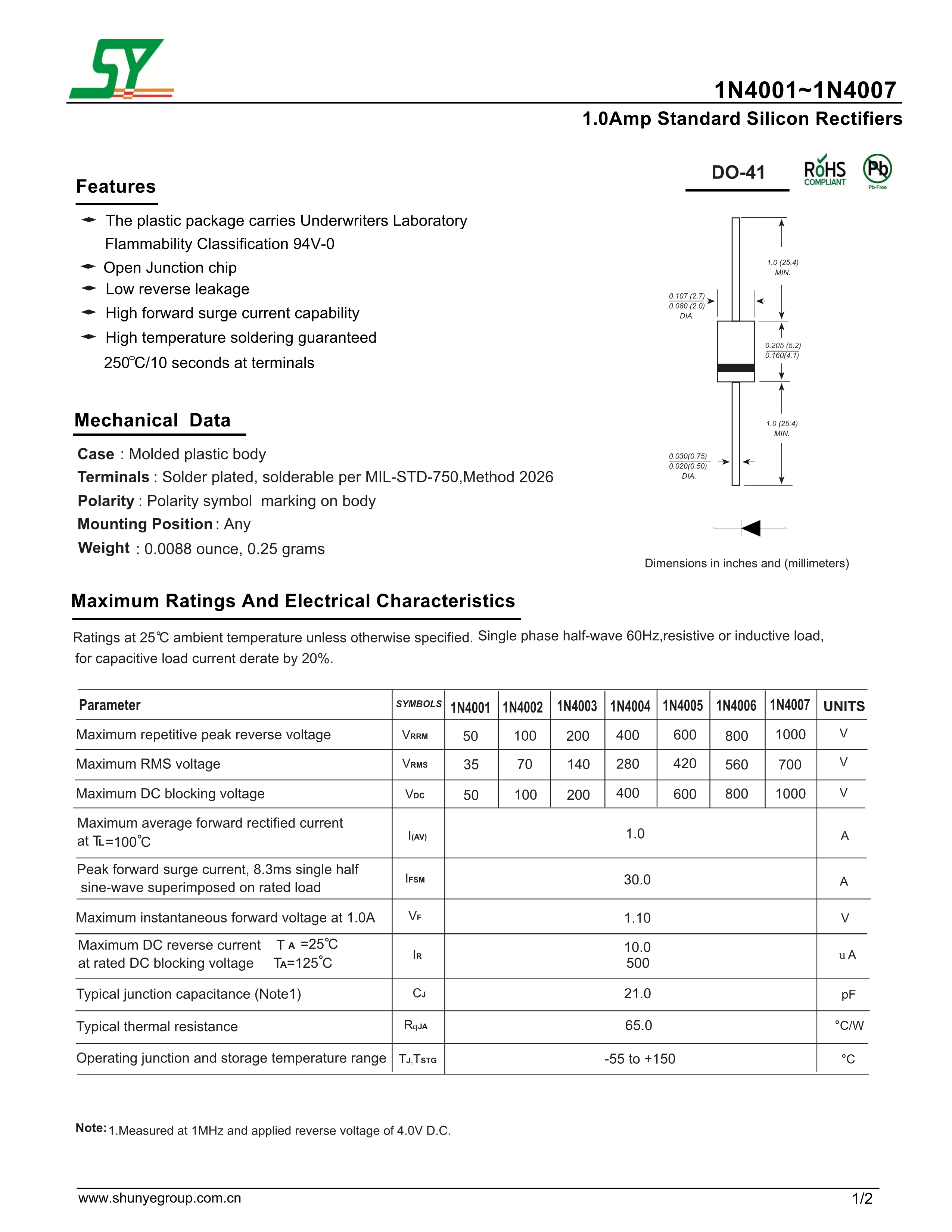 1N4007数据手册DO-41封装SY(顺烨)PDF规格书,中英文下载