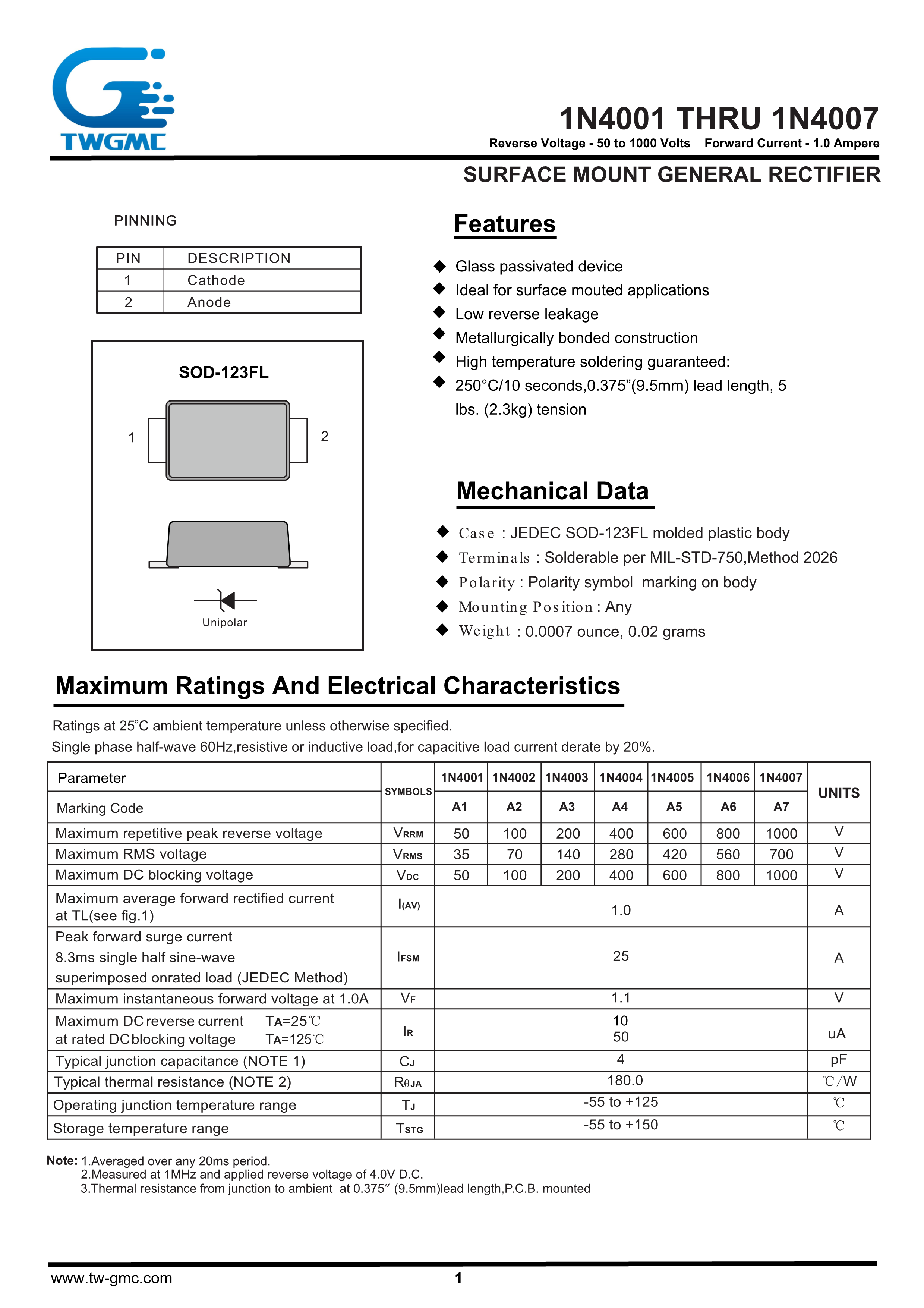 1N4007数据手册SOD-123FL封装TWGMC(台湾迪嘉)PDF规格书,中英文下载