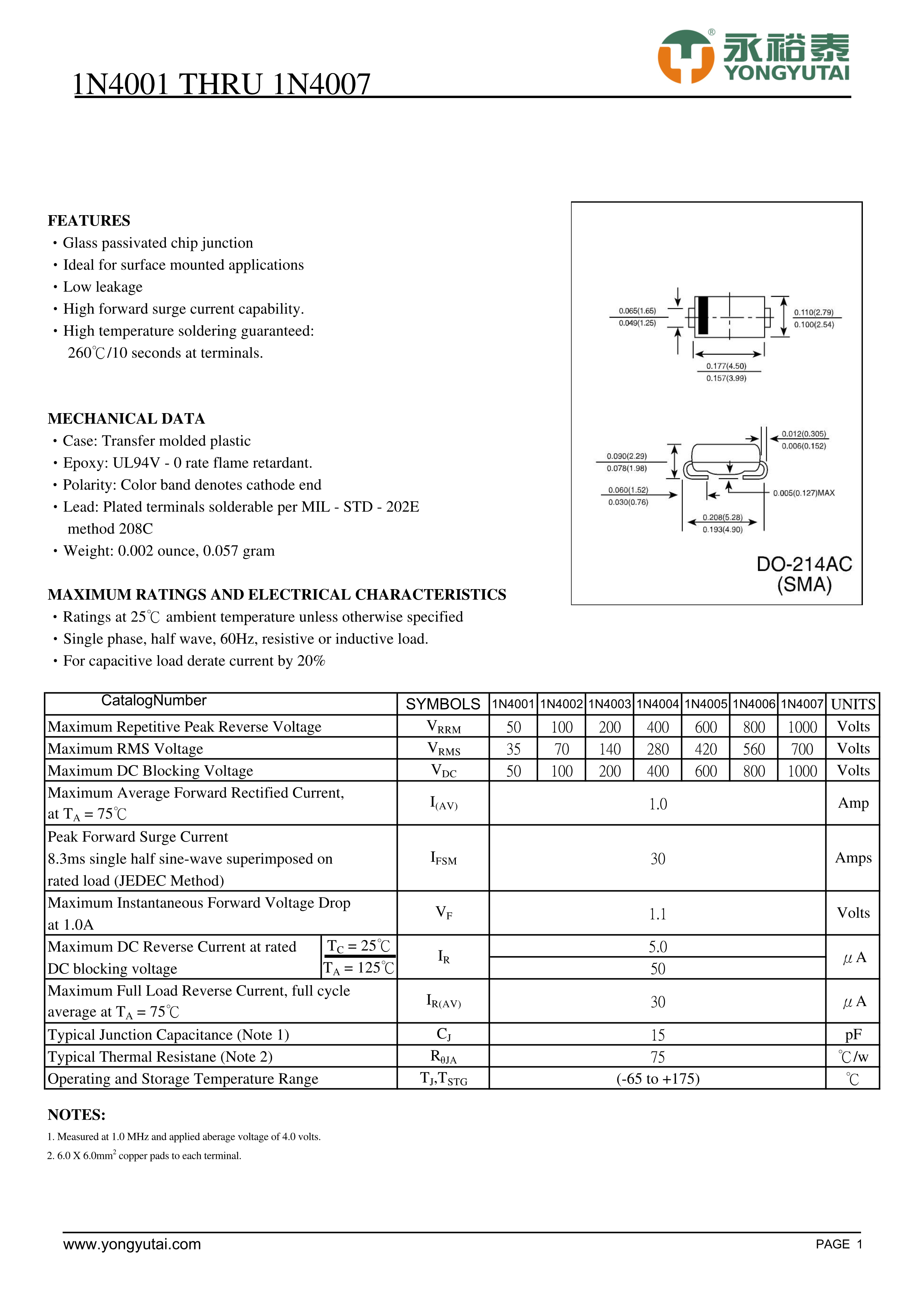 1N4007数据手册SMA(DO-214AC)封装YONGYUTAI(永裕泰)PDF规格书,中英文下