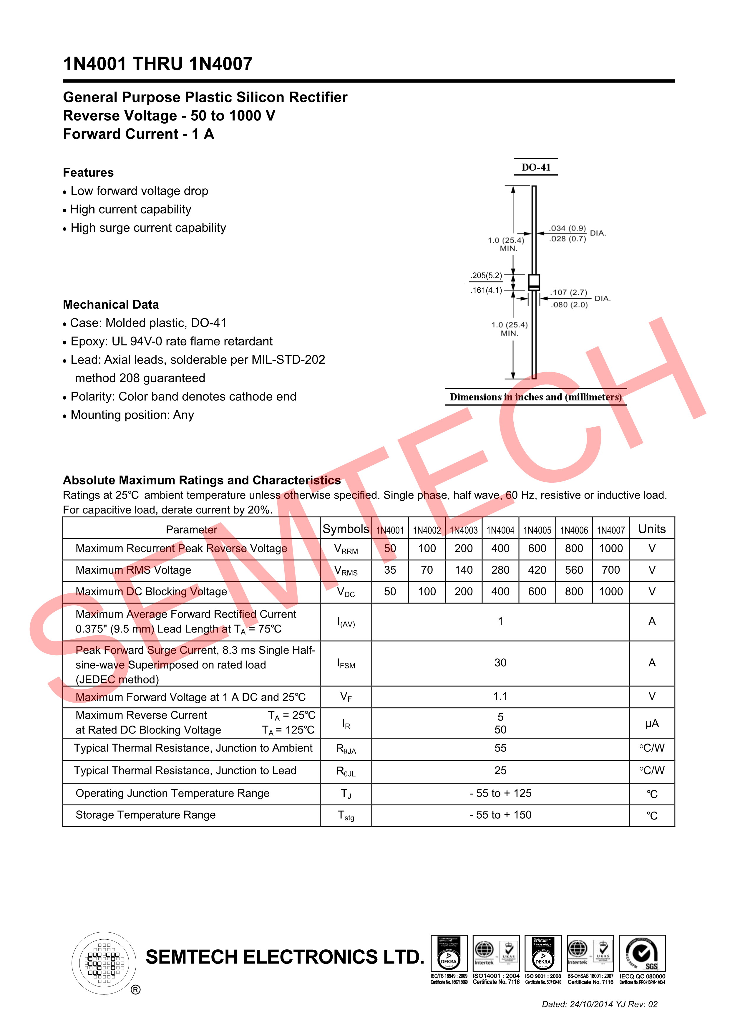 1N4007数据手册DO-41封装LGE(鲁光)PDF规格书,中英文下载
