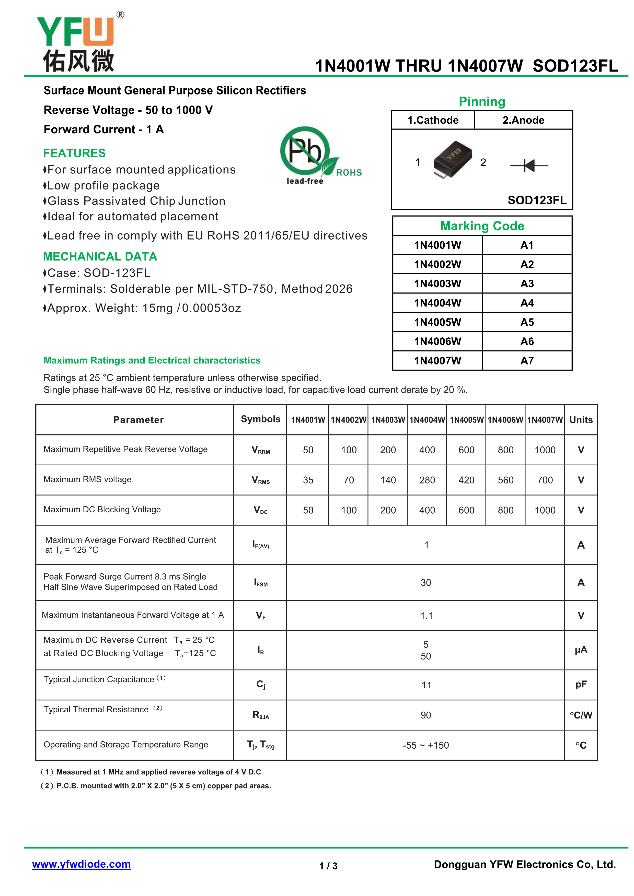 1N4007W数据手册SOD-123FL封装YFW(佑风微)PDF规格书,中英文下载