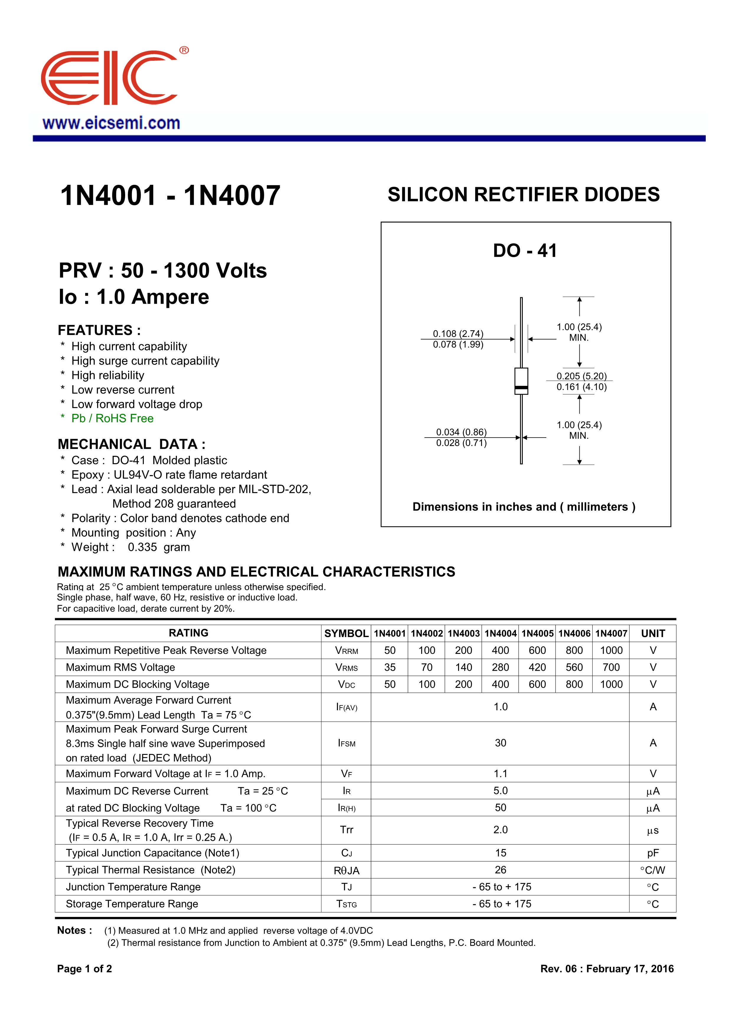 1N4007数据手册DO-41封装EICPDF规格书,中英文下载