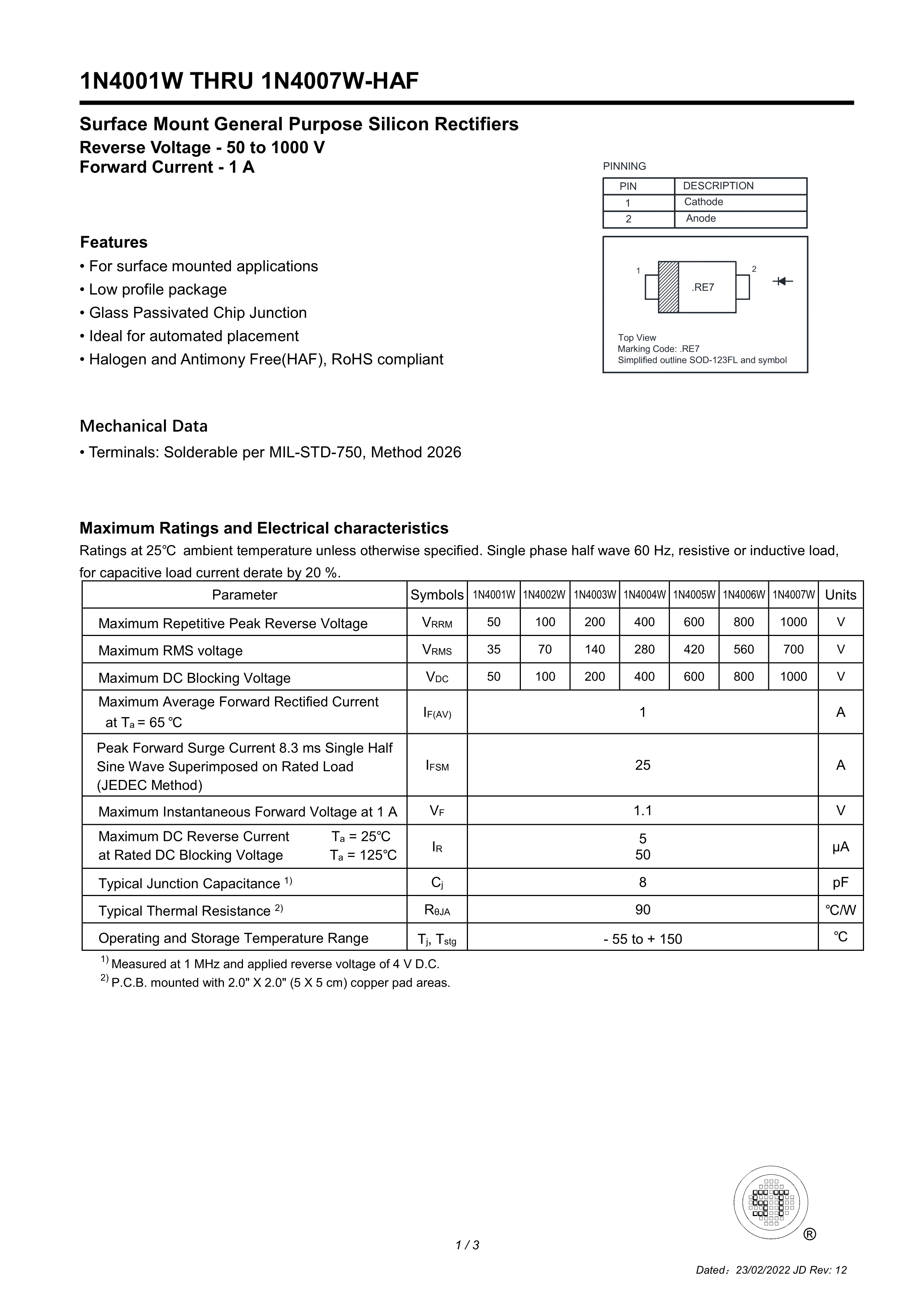 1N4007W-HAF数据手册SOD-123FL封装ST(先科)PDF规格书,中英文下载
