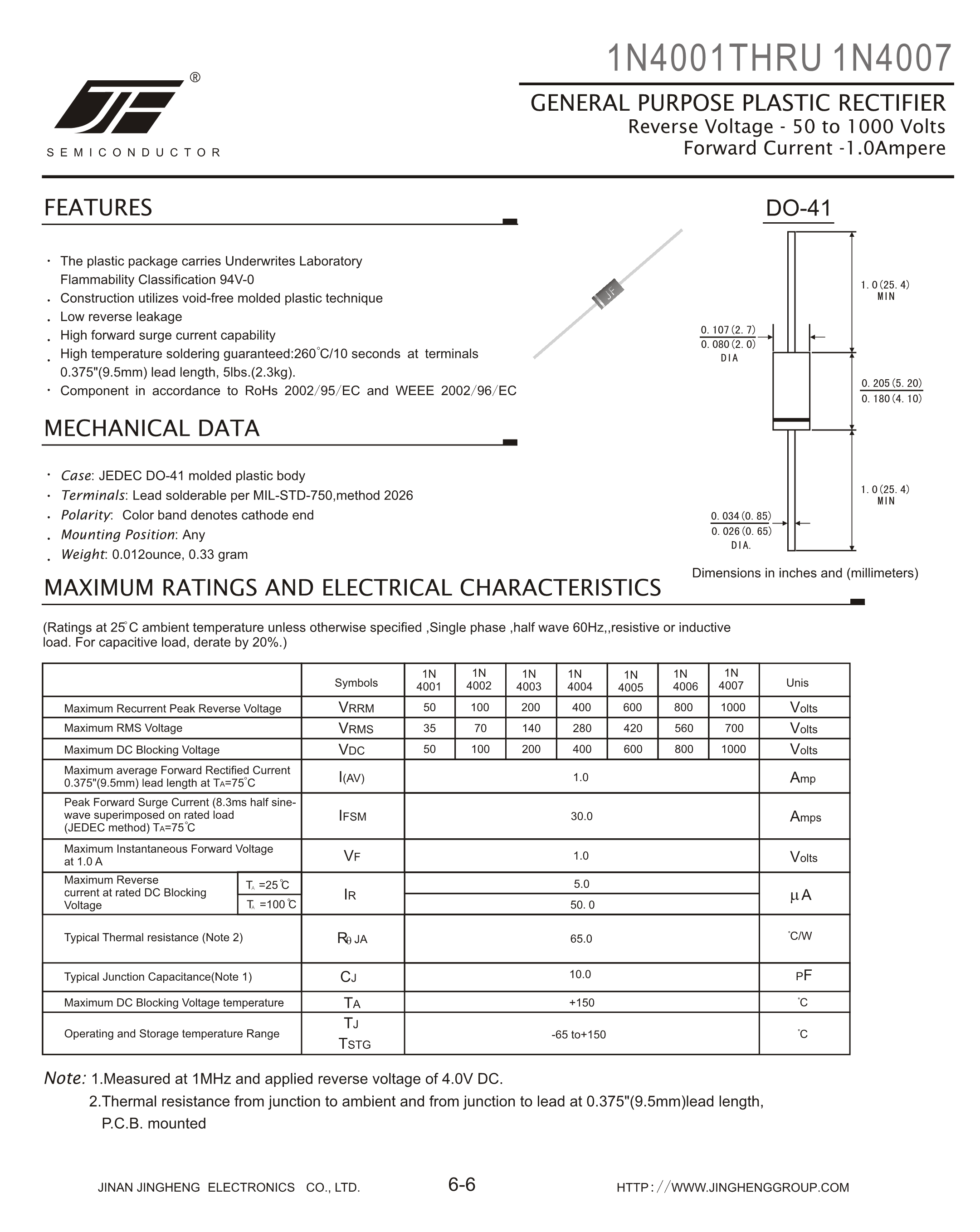 1N4007数据手册DO-41封装JF(吉福)PDF规格书,中英文下载