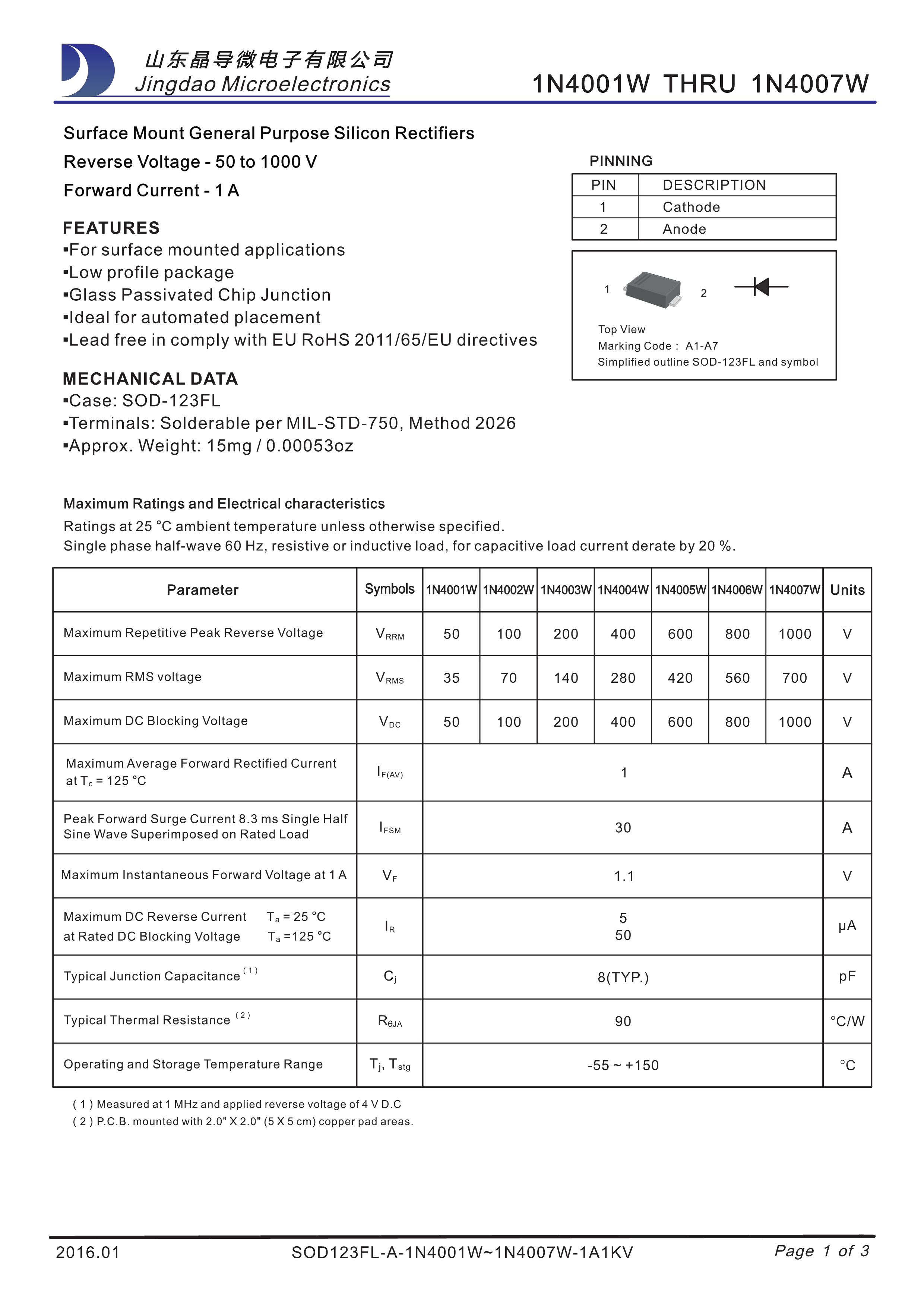 1N4007W数据手册SOD-123FL封装晶导微电子PDF规格书,中英文下载