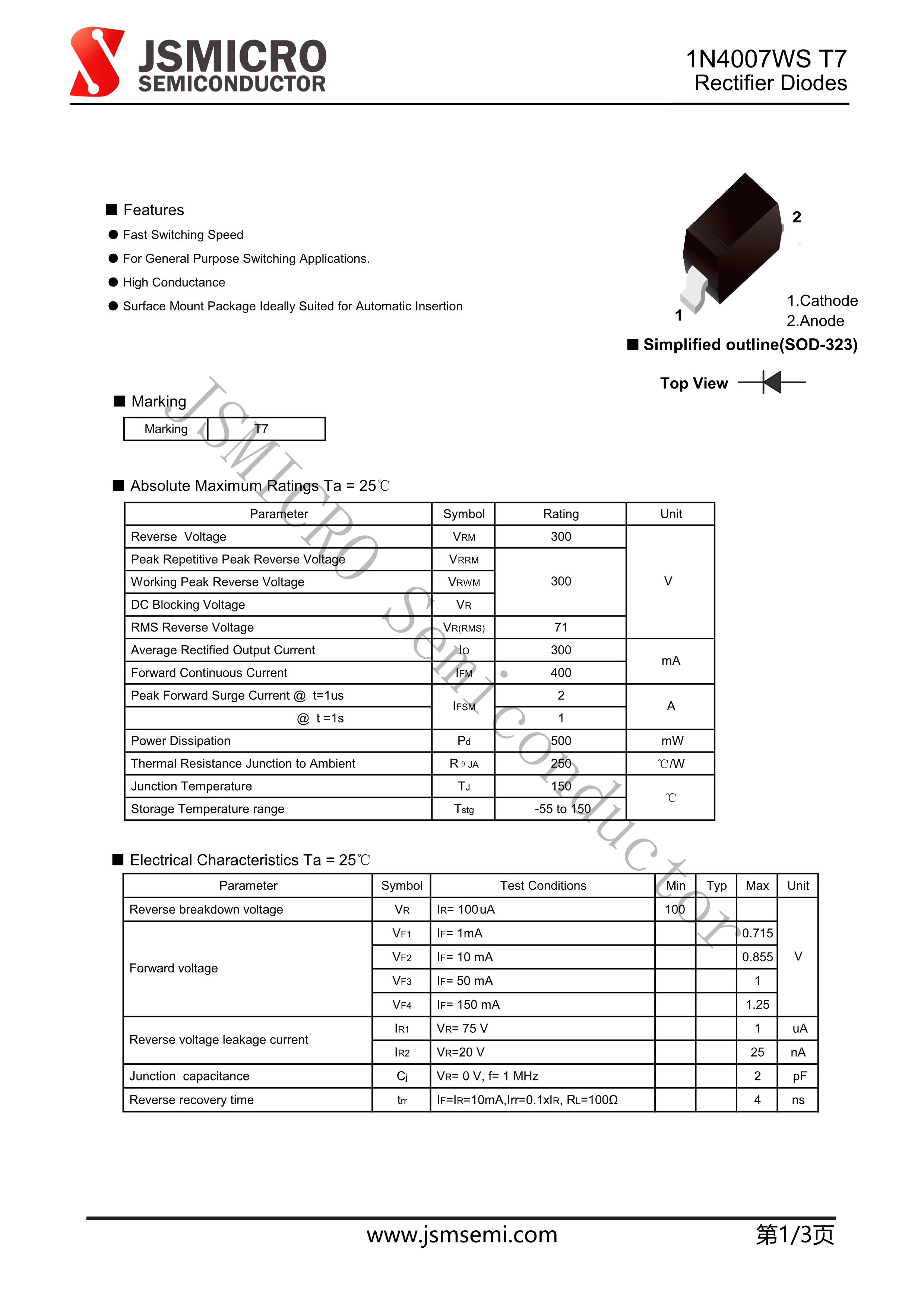 1N4007WS数据手册SOD-323封装JSMSEMI(杰盛微)PDF规格书,中英文下载
