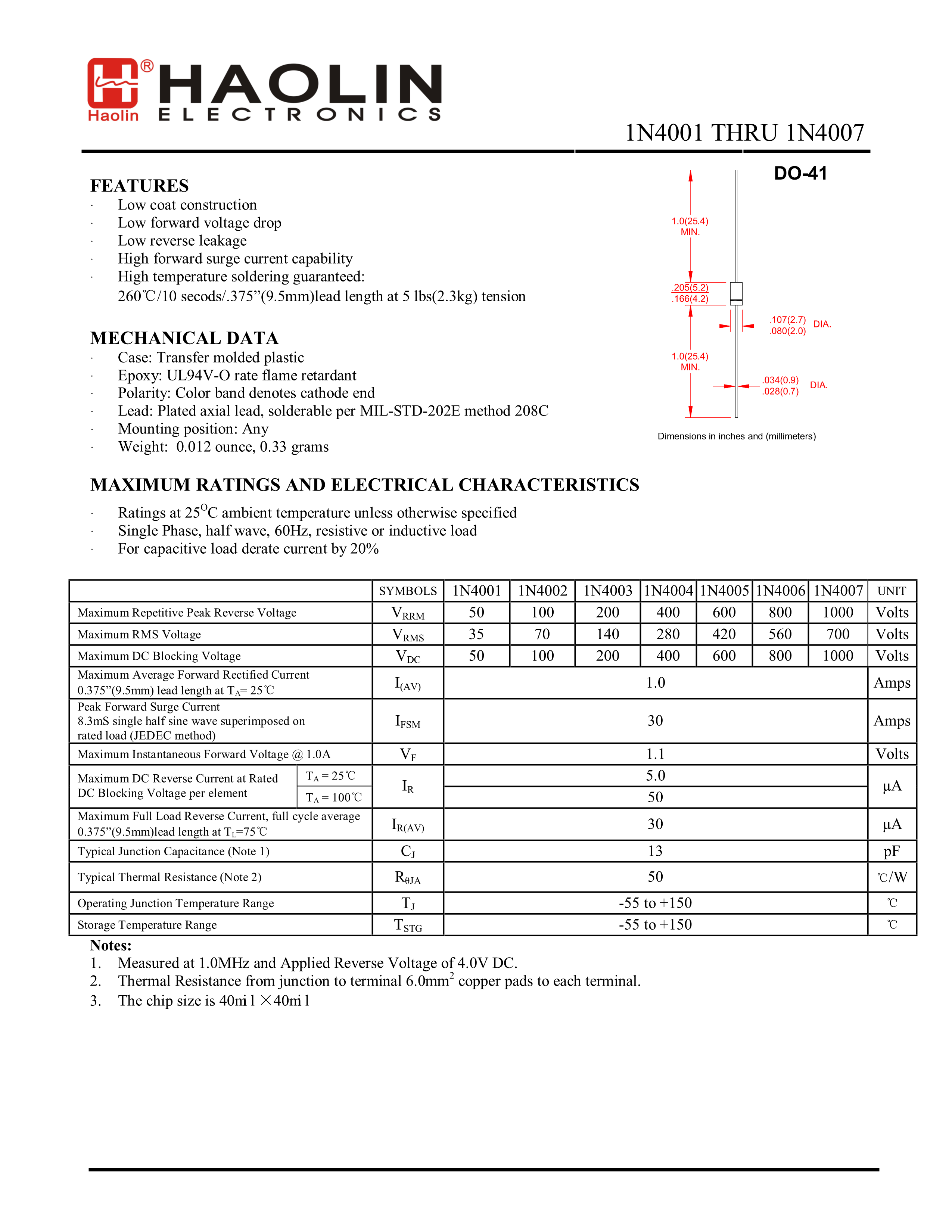 1n4007数据手册DO-41封装HL(豪林)PDF规格书,中英文下载