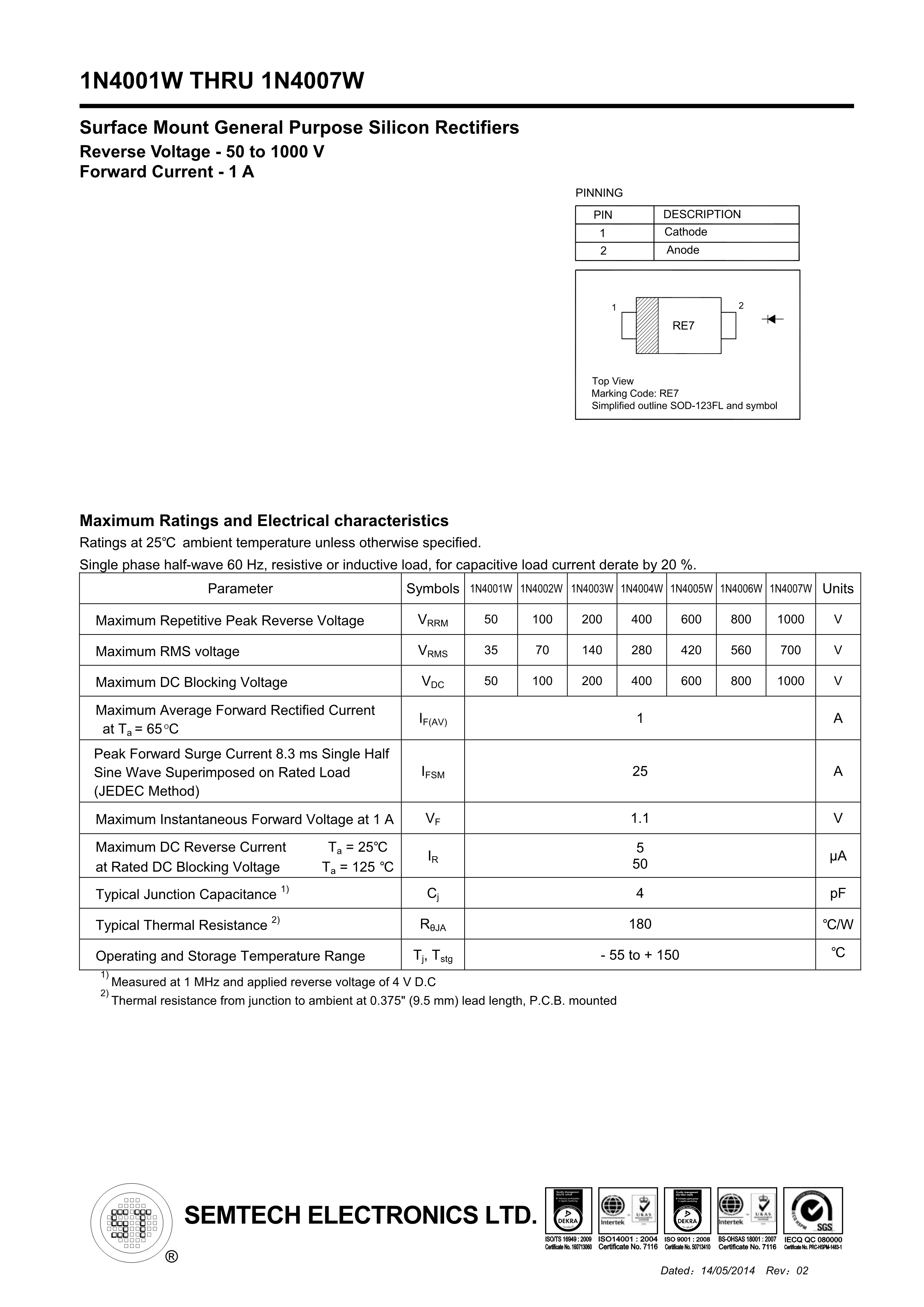 1N4007W数据手册SOD-123FL封装ST(先科)PDF规格书,中英文下载