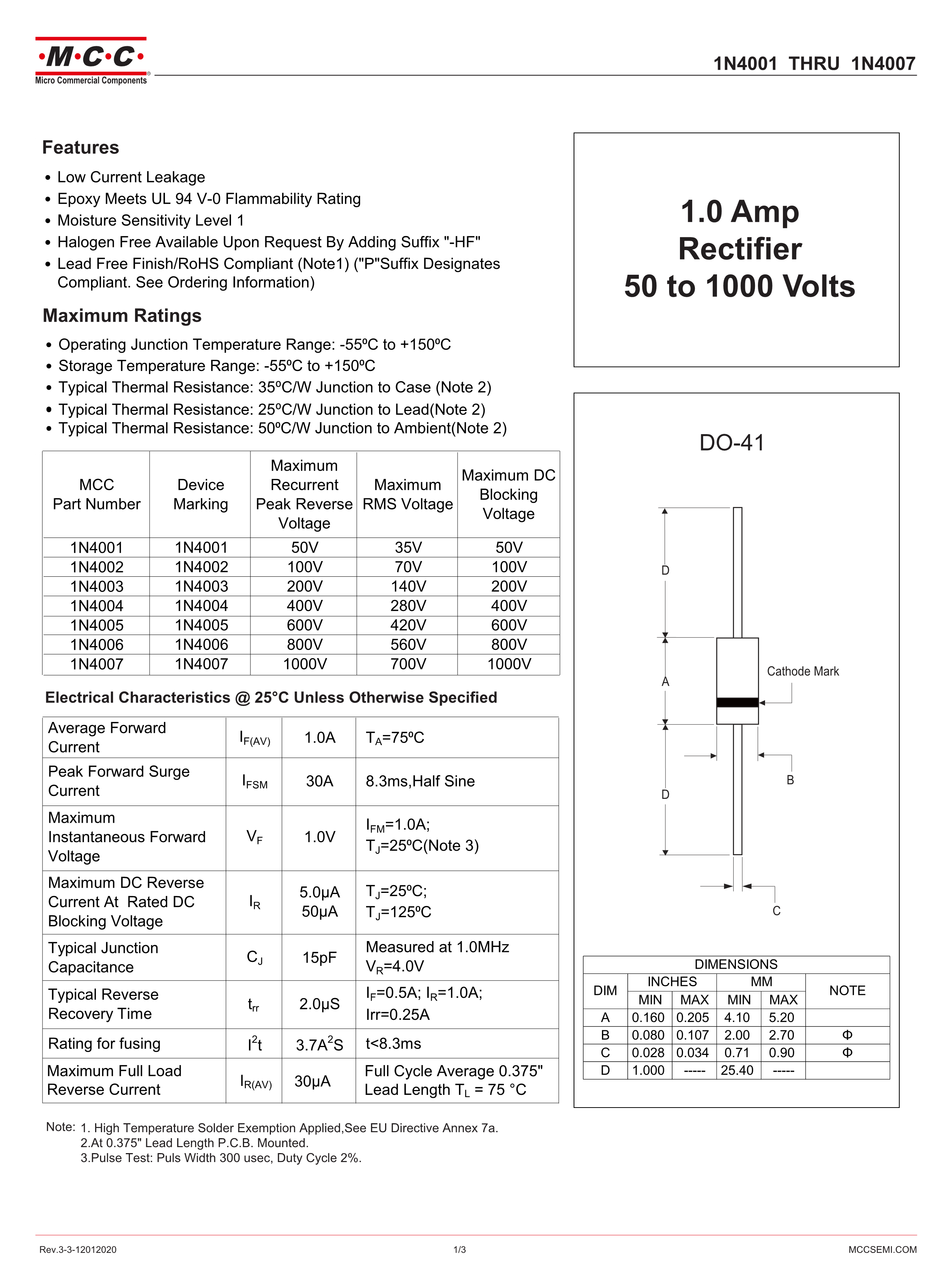1N4007-AP数据手册DO-41封装MCC(美微科)PDF规格书,中英文下载