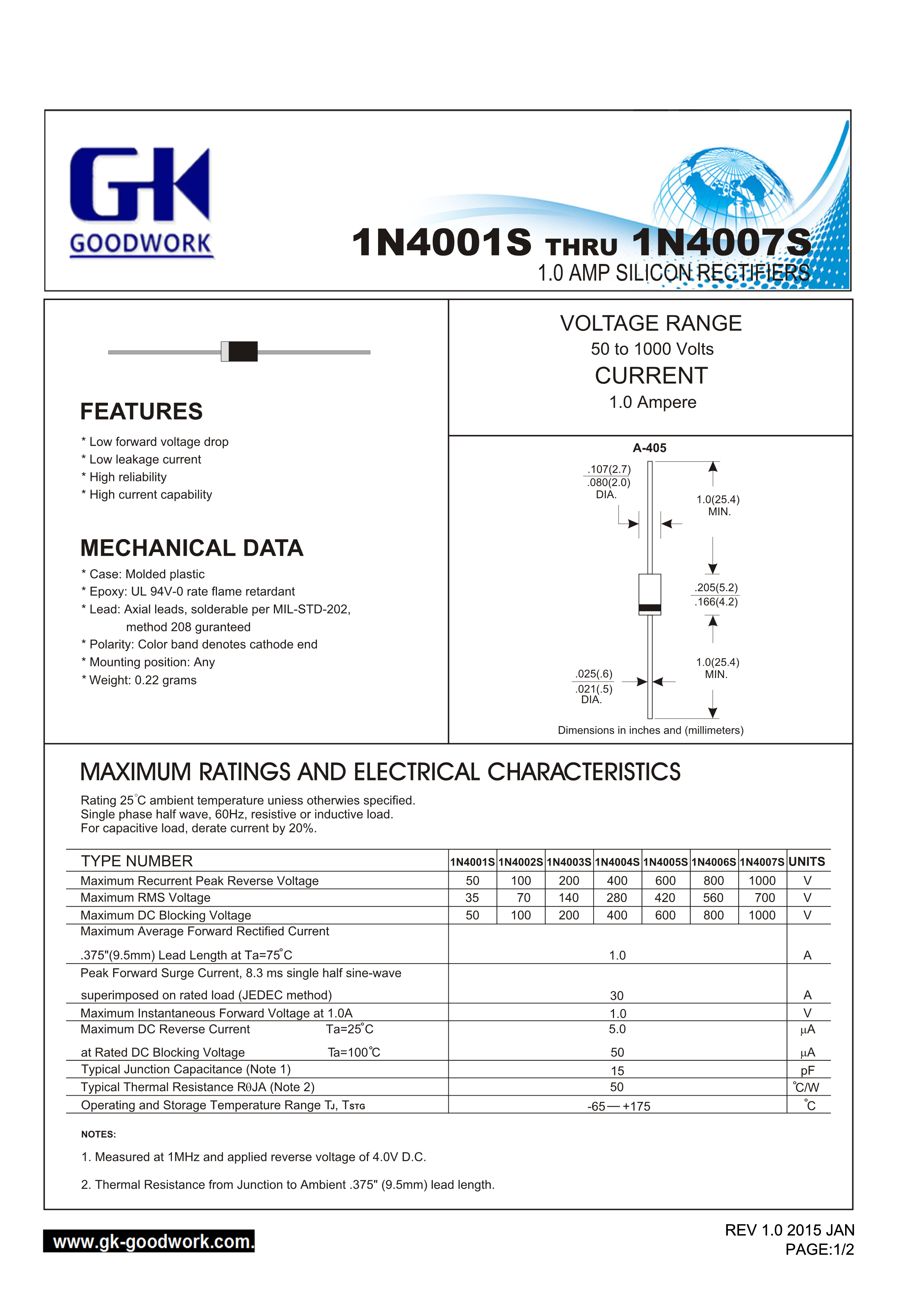 1N4007-B数据手册A405封装GOODWORK(固得沃克)PDF规格书,中英文下载