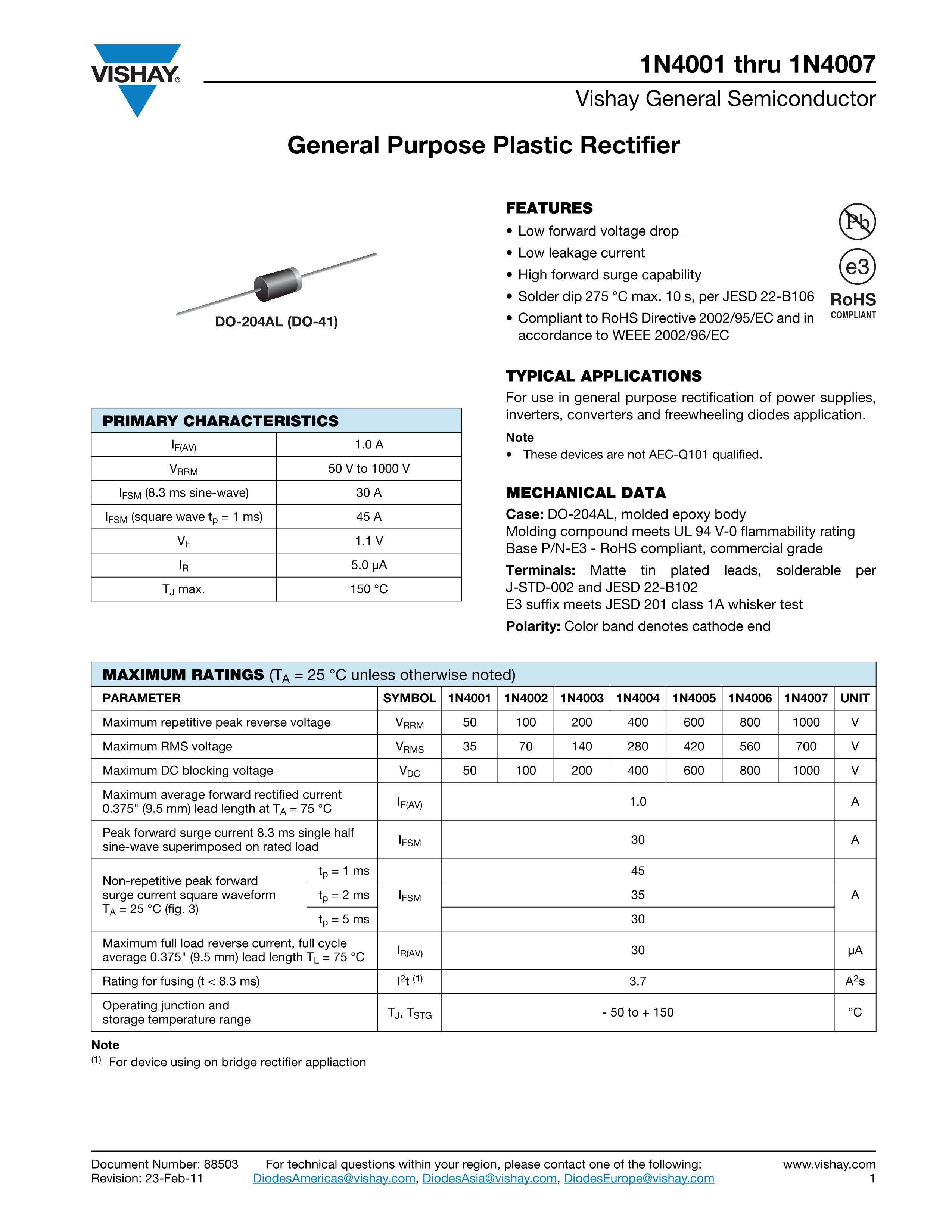 1N4007-E3-73数据手册DO-204AL封装VISHAY(威世)PDF规格书,中英文下载