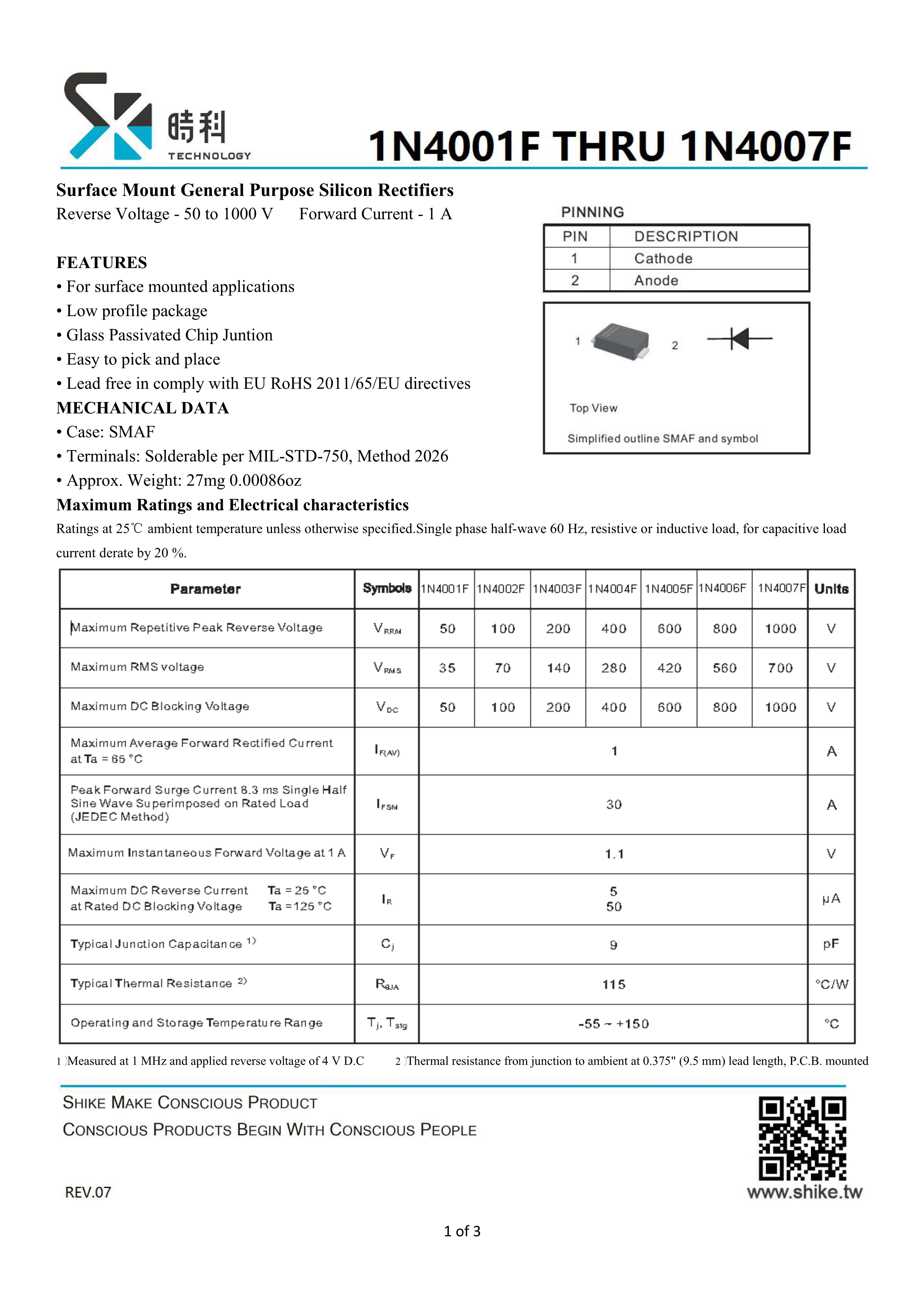 1N4007F数据手册SMAF封装SHIKUES(时科)PDF规格书,中英文下载
