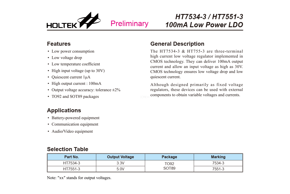 HT7551,100mA低功率LDO芯片PDF规格书下载