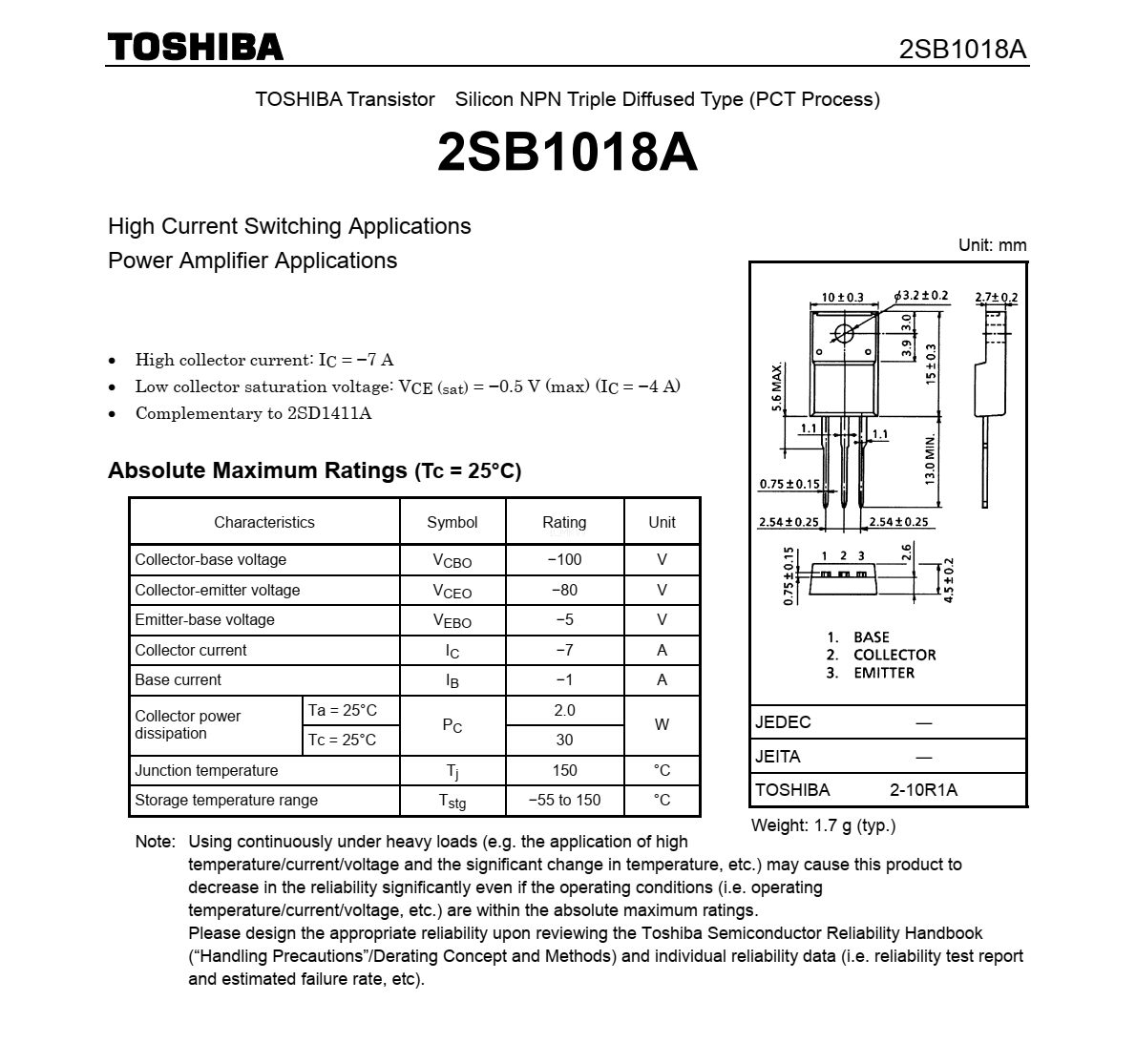 2SB1018A,大电流开关功率放大器应用芯片PDF规格书下载