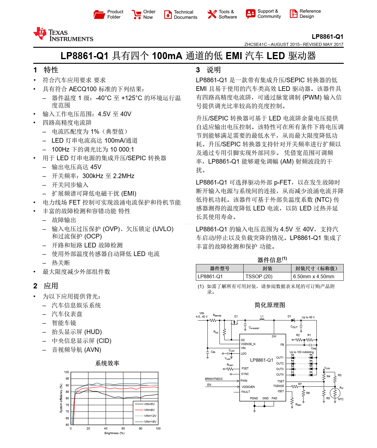 LP8861QPWPRQ1,有四个100mA通道的低EMI 汽车LED 驱动器芯片PDF规格书下载