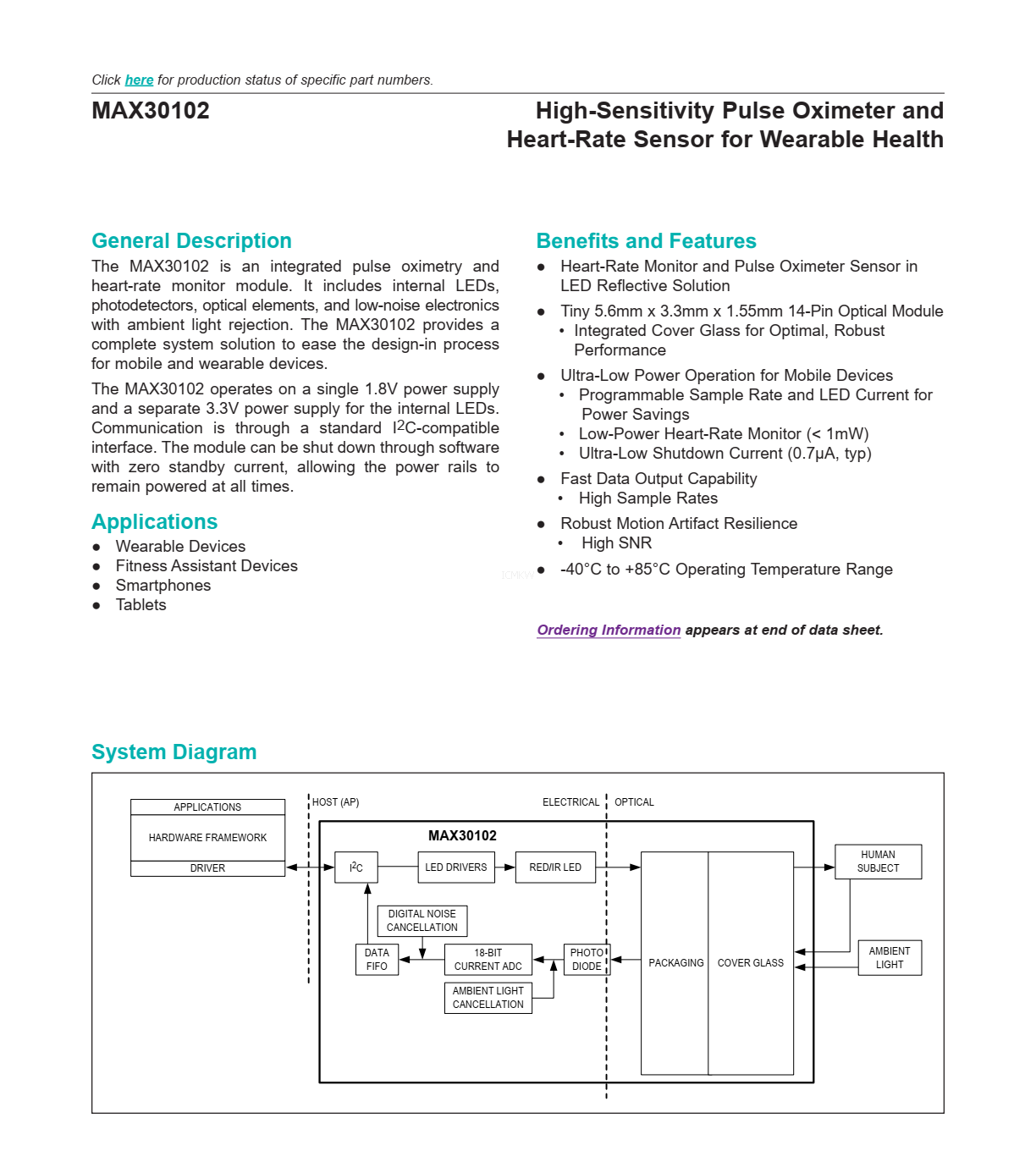 MAX30102,适用于穿戴式健康的高灵敏度脉搏血氧仪和心率传感器芯片PDF规格书下载