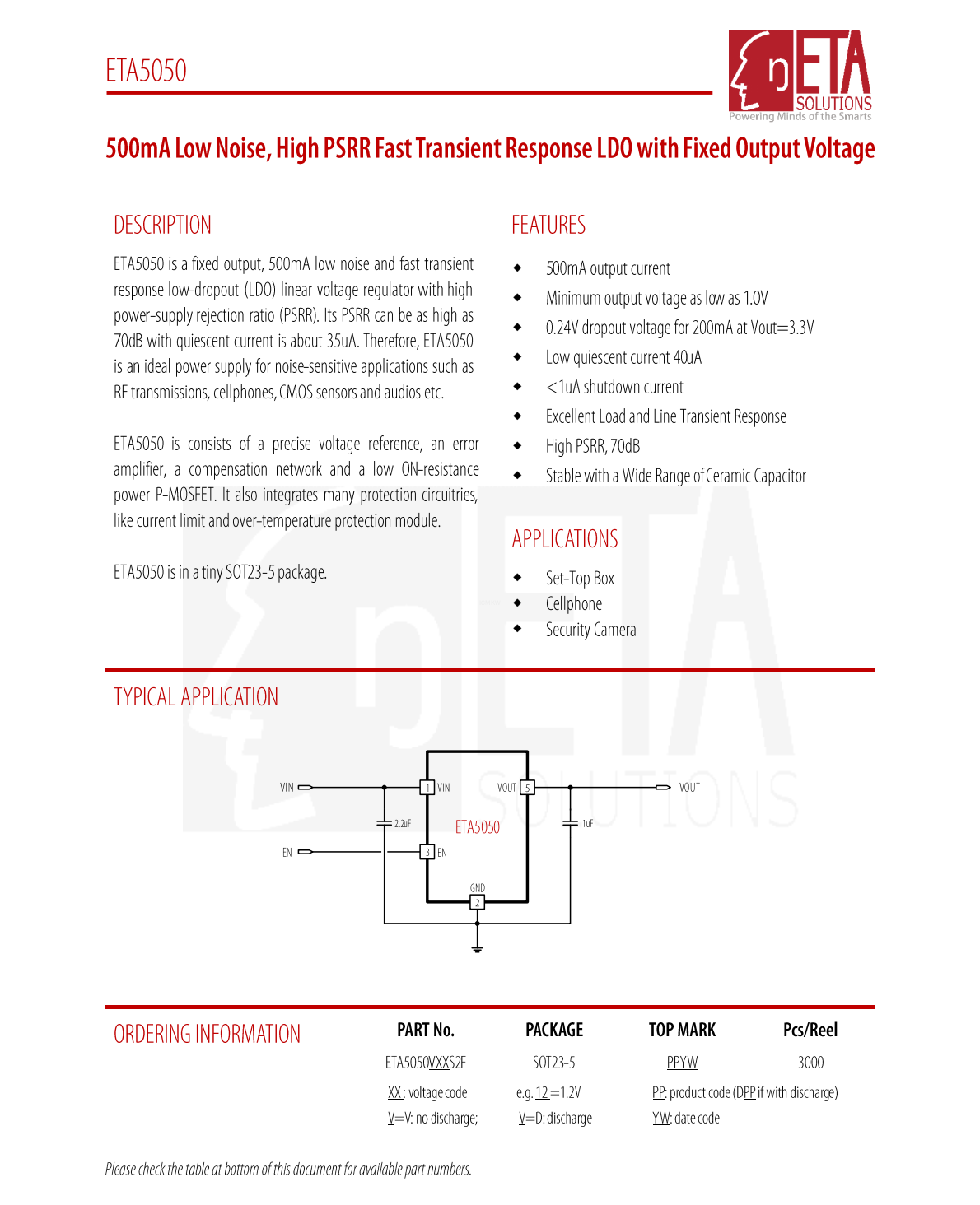 ETA5050V33S2F,具有固定输出电压的500MA低噪声快速瞬态响应LDO芯片PDF规格书下载