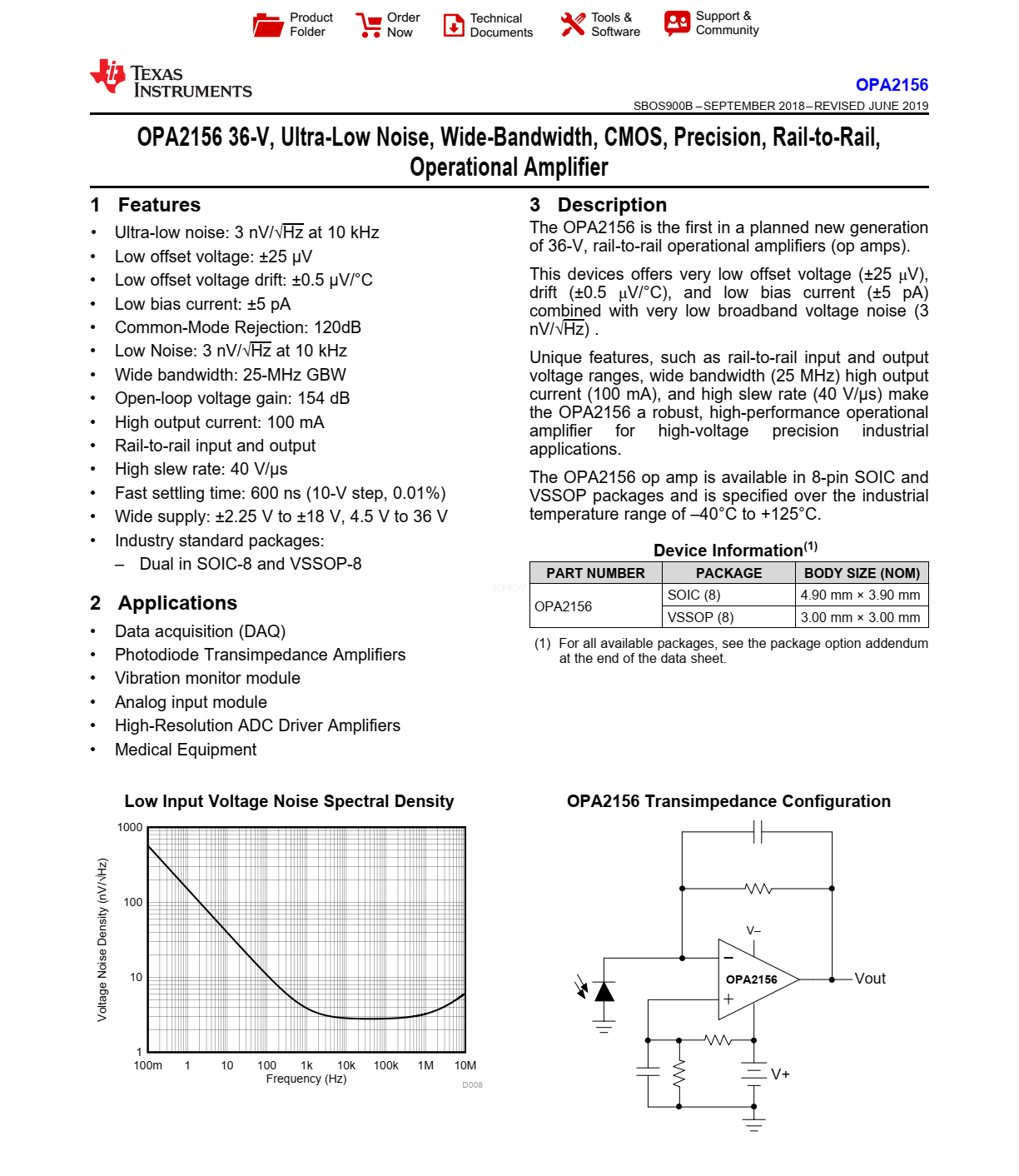 OPA2156,超低噪声,宽频带,CMOS,精密,轨对轨芯片PDF规格书下载