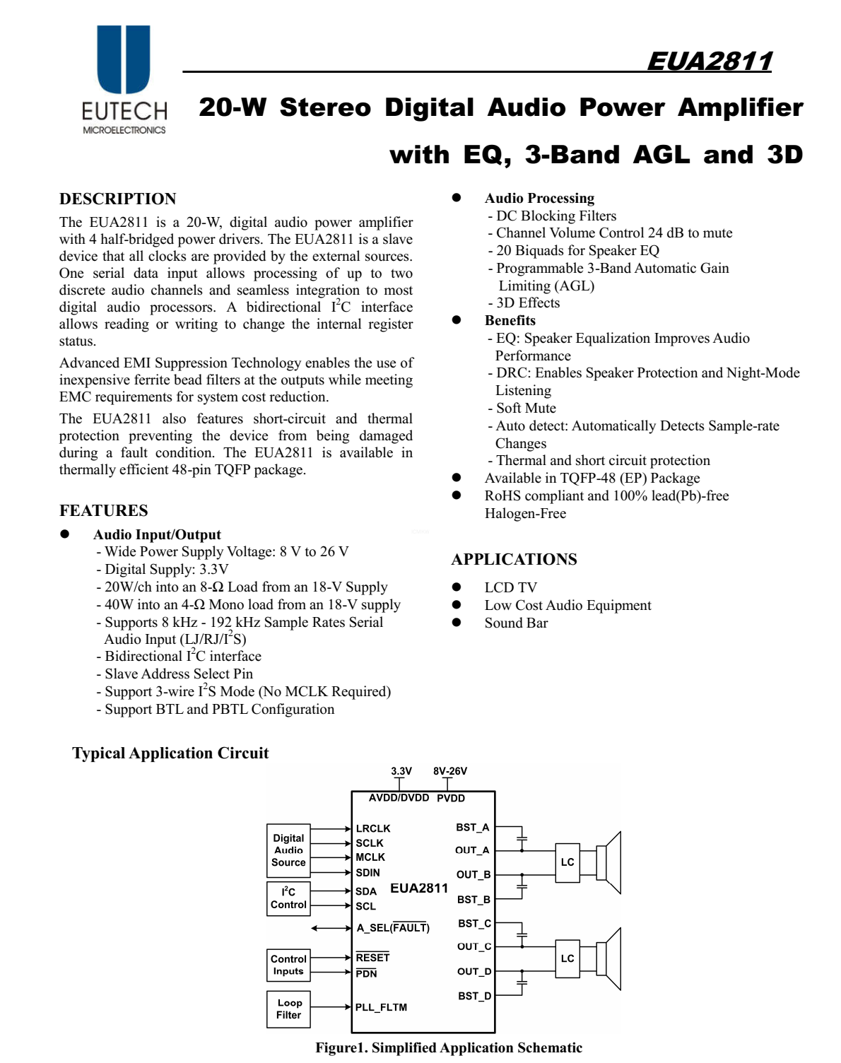 EUA2811,20-W立体声数字音频功率放大器,带EQ、3波段AGL和3D芯片PDF规格书下载