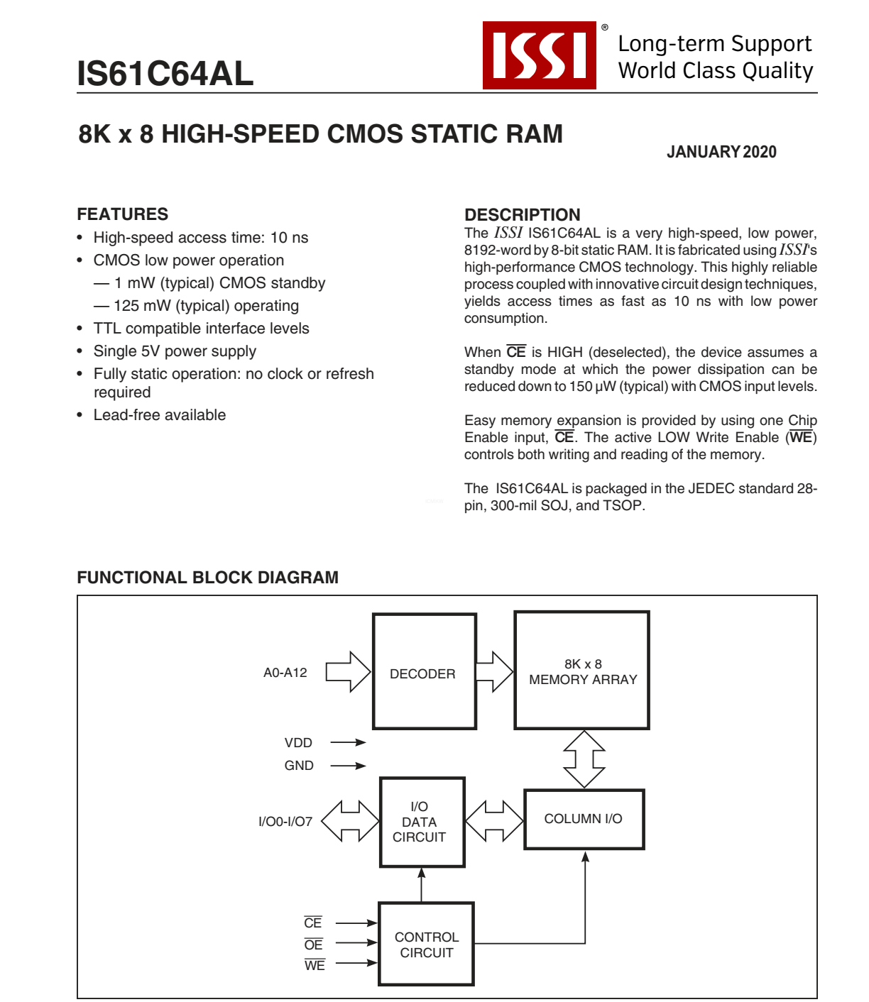 IS61C64,非常高速、低功耗、低功耗的8192字乘8位静态芯片PDF规格书下载