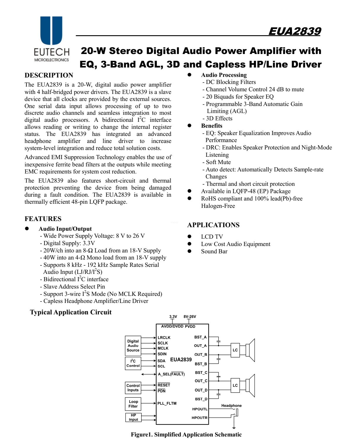 EUA2839,20-W立体声数字音频功率放大器EQ、3波段AGL、3D和无盖HP/Line驱动器芯片PDF规格书下载