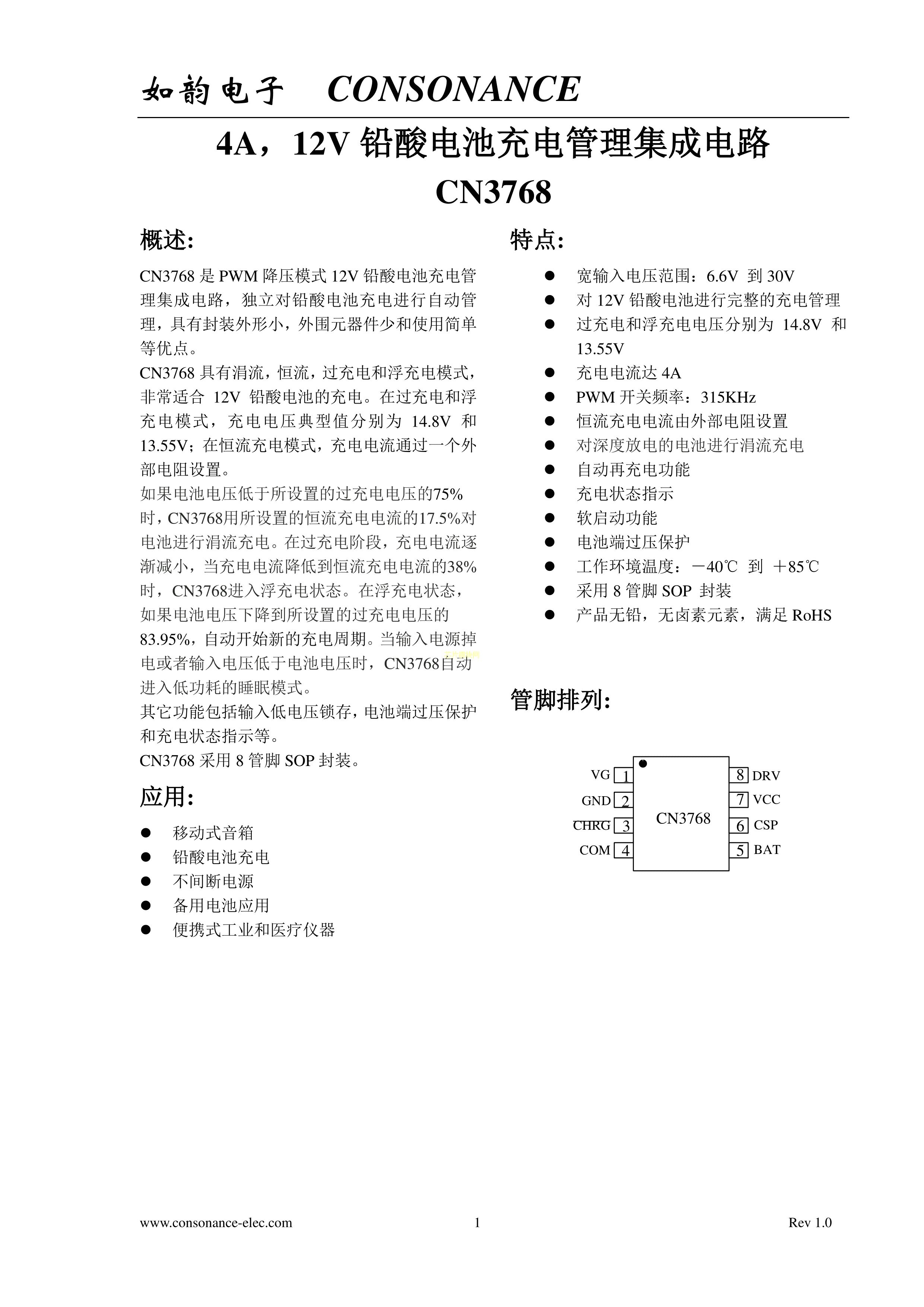铅酸电池充电芯片CN3768PDF规格书,中英文下载