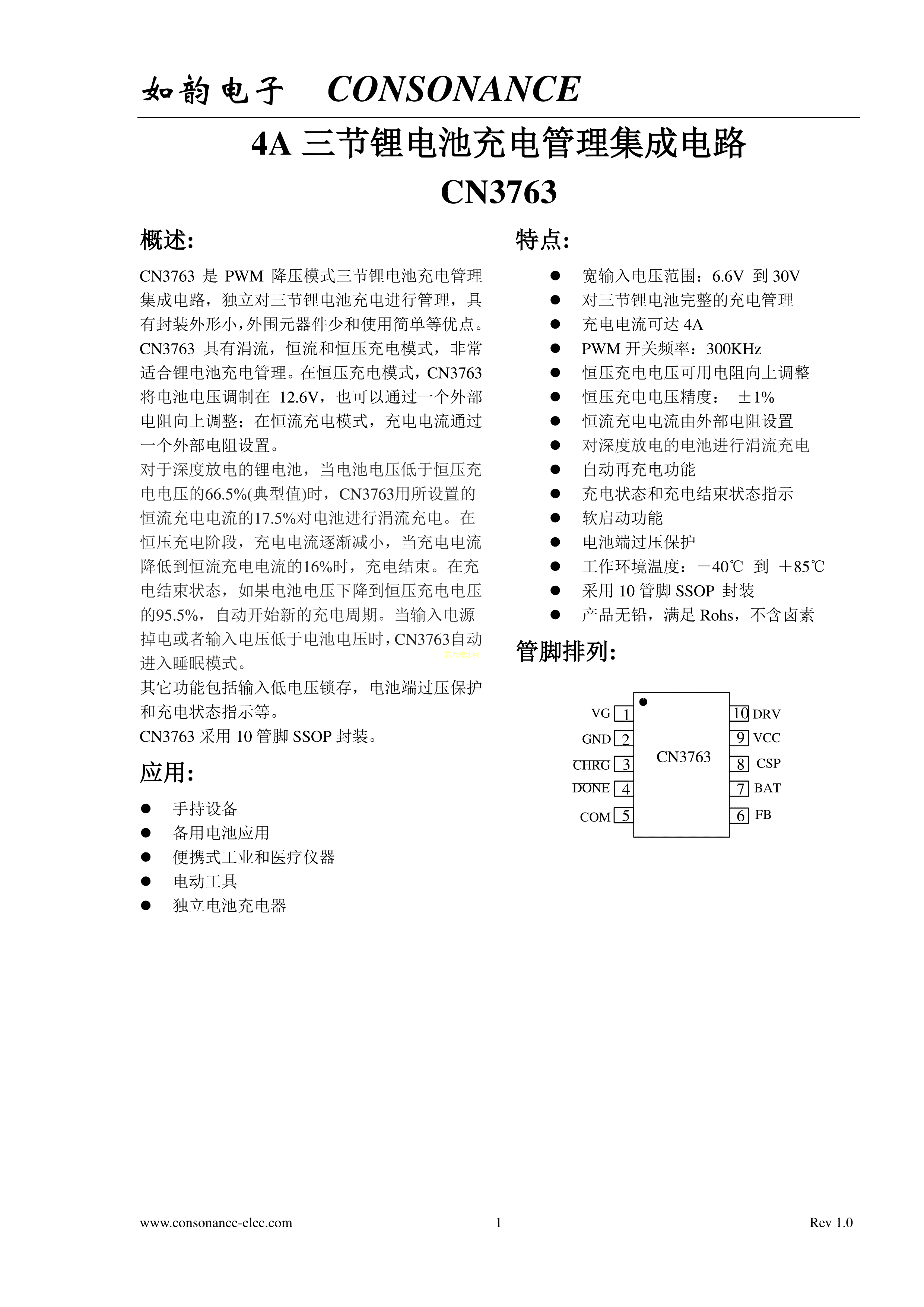 锂电池充电芯片CN3763PDF规格书,中英文下载