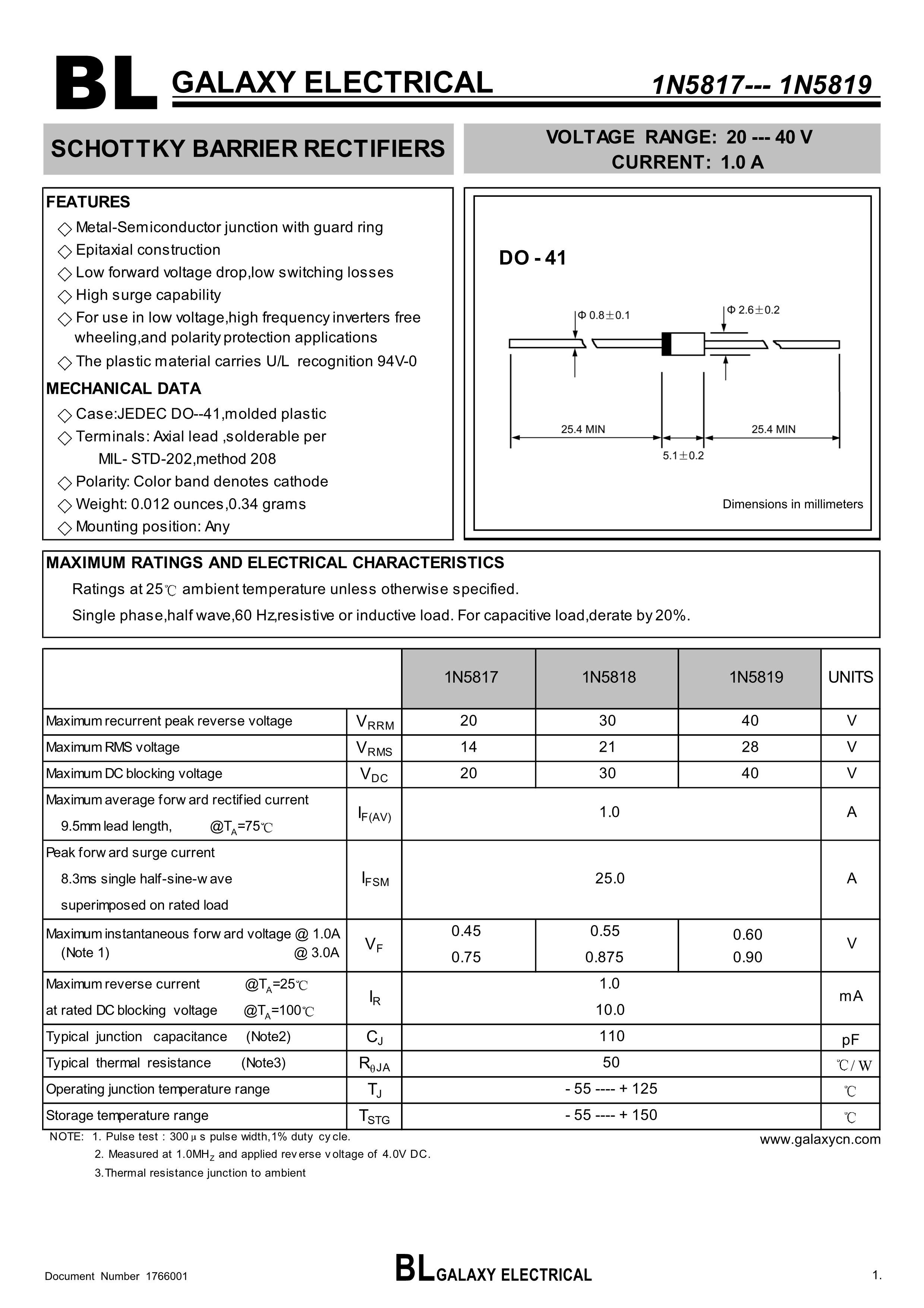 1N5819数据手册DO-41封装银河微电子PDF规格书,中英文下载
