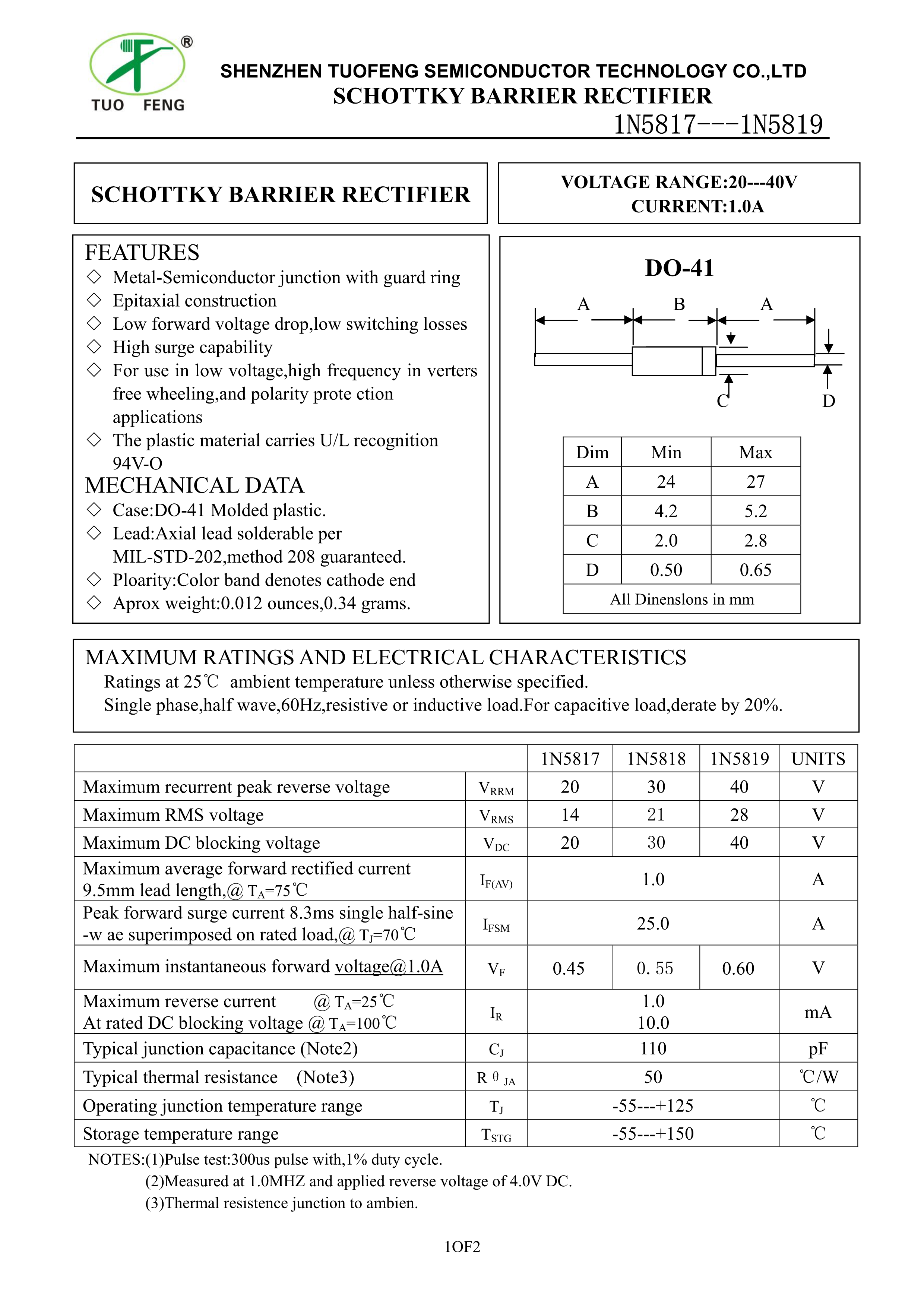 1N5819数据手册DO-41封装TF(拓锋)PDF规格书,中英文下载