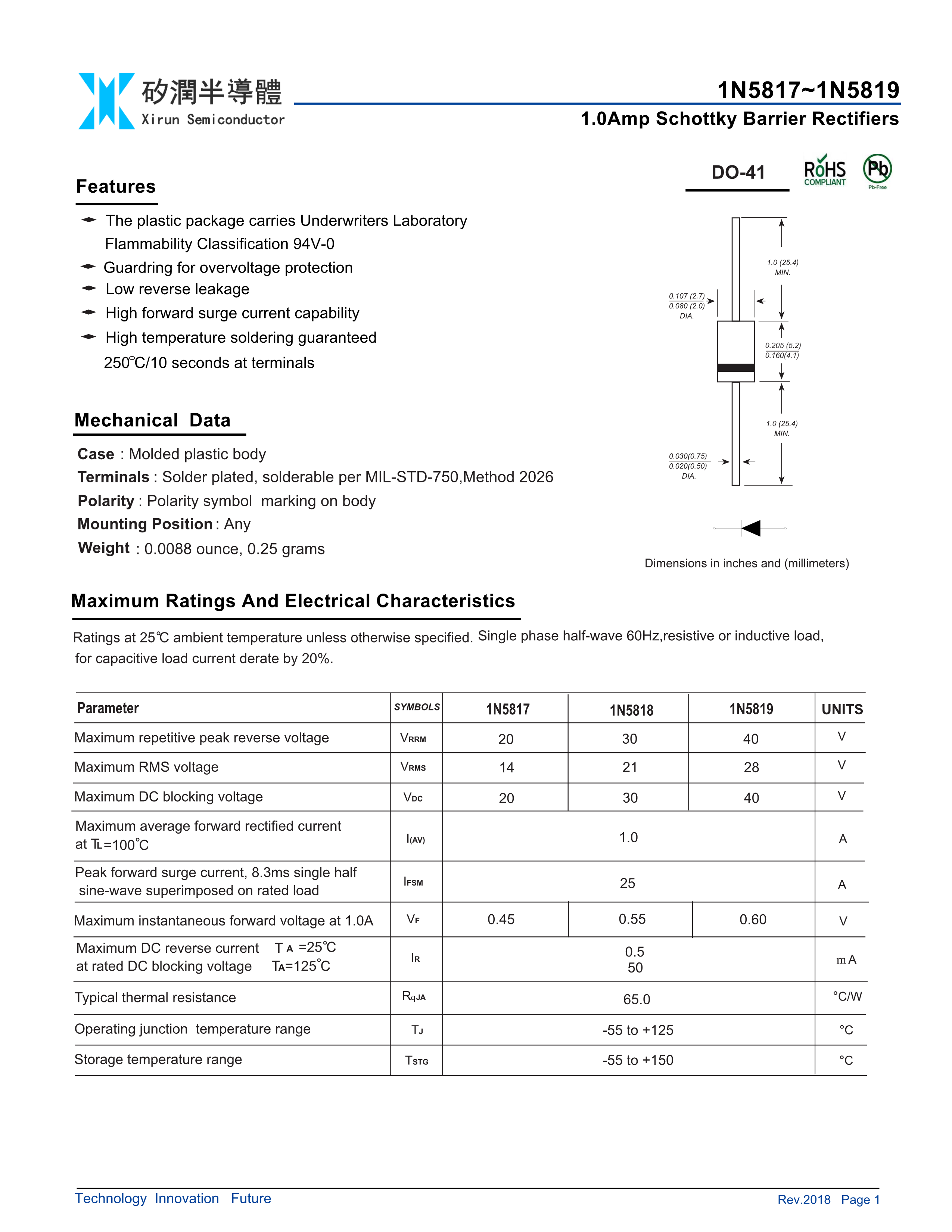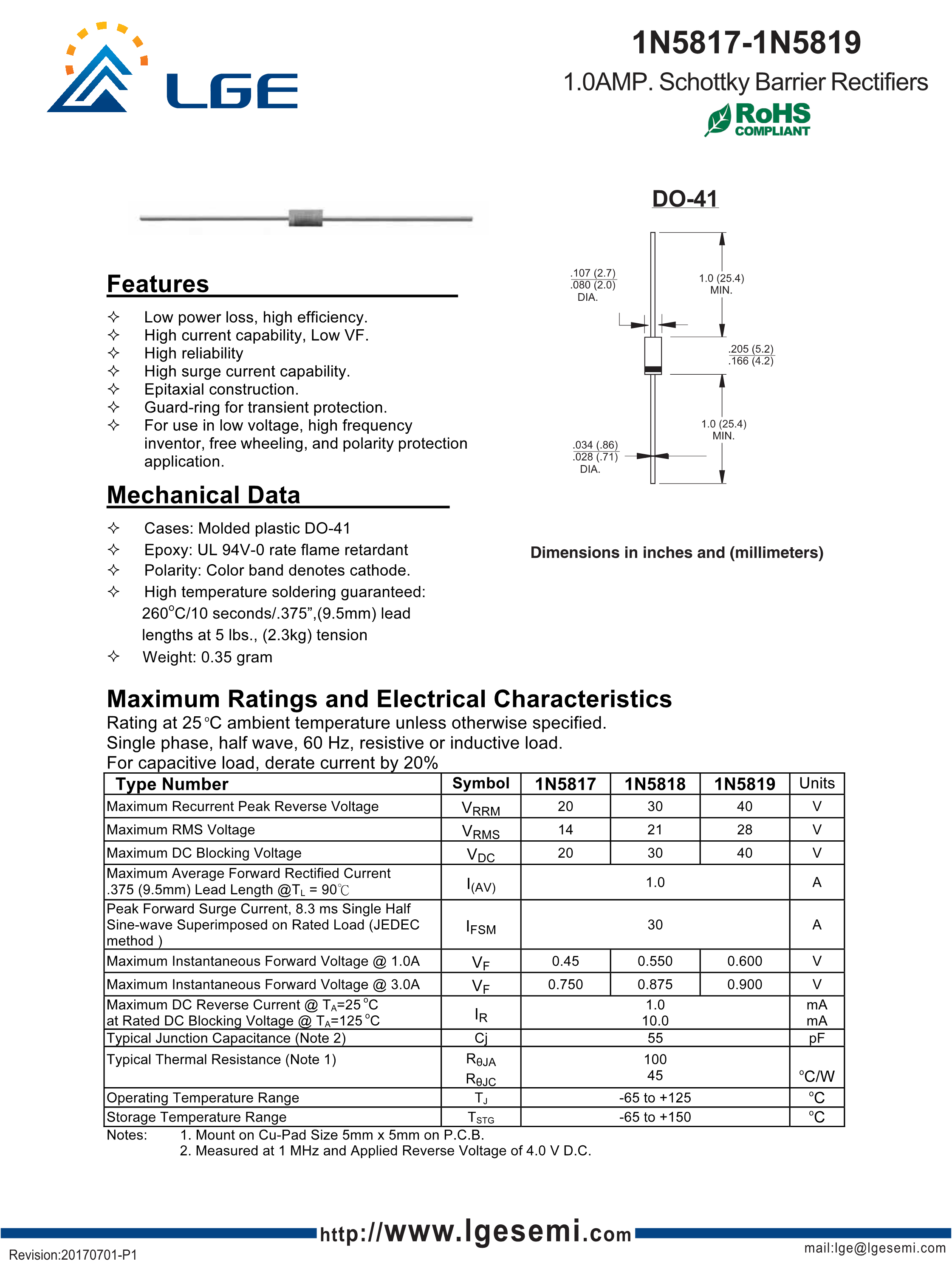 1N5819数据手册DO-41封装LGE(鲁光)PDF规格书,中英文下载