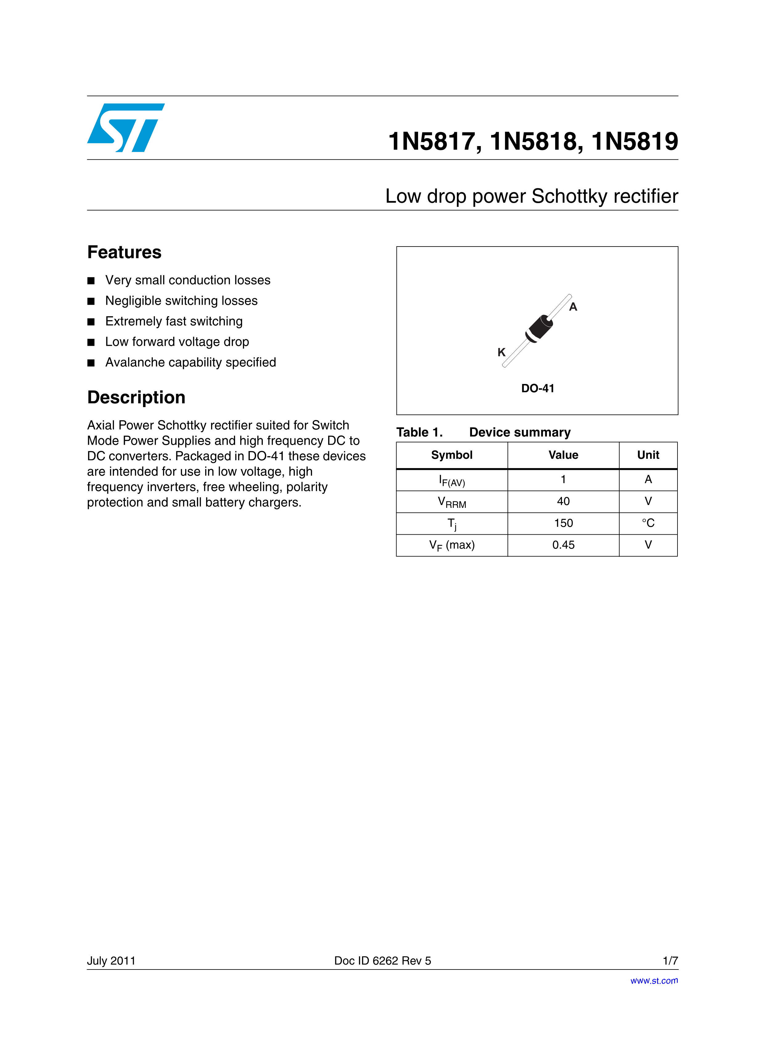 1N5819数据手册DO-41封装ST(意法半导体)PDF规格书,中英文下载