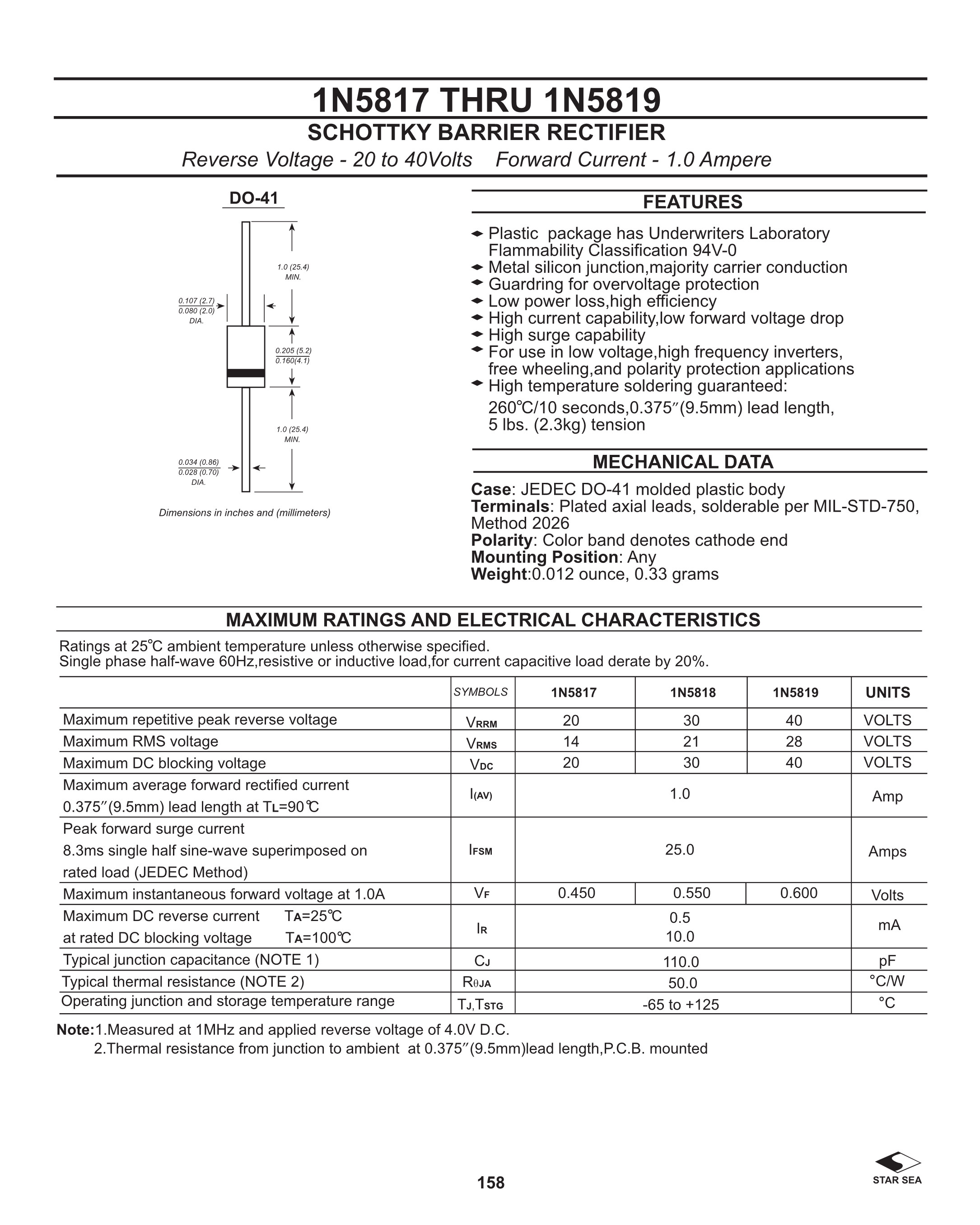 1N5819数据手册DO-41封装星海PDF规格书,中英文下载
