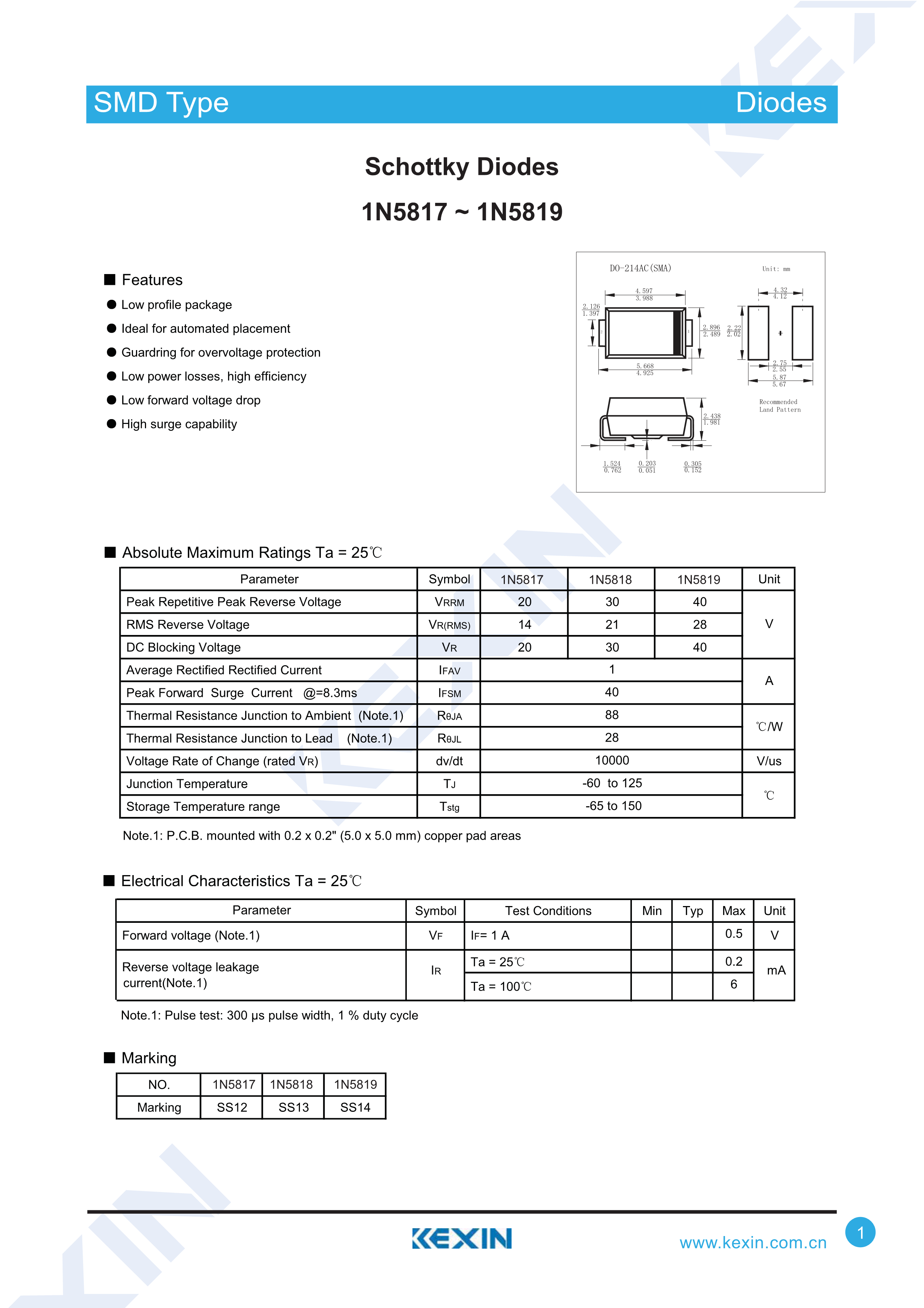 1N5819数据手册SMA封装KEXIN(科信)PDF规格书,中英文下载