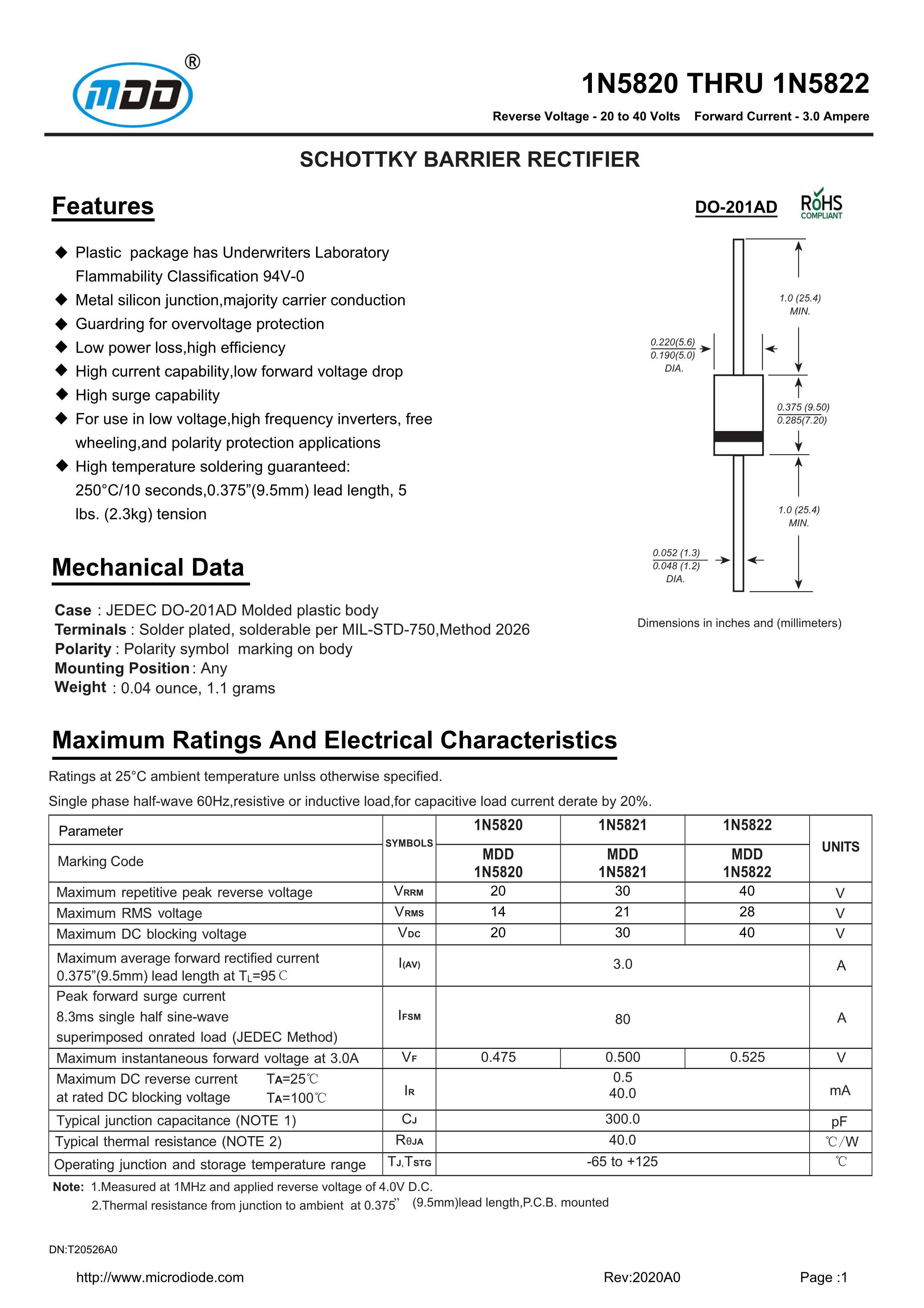 1N5822数据手册DO-201AD封装MDDPDF规格书,中英文下载