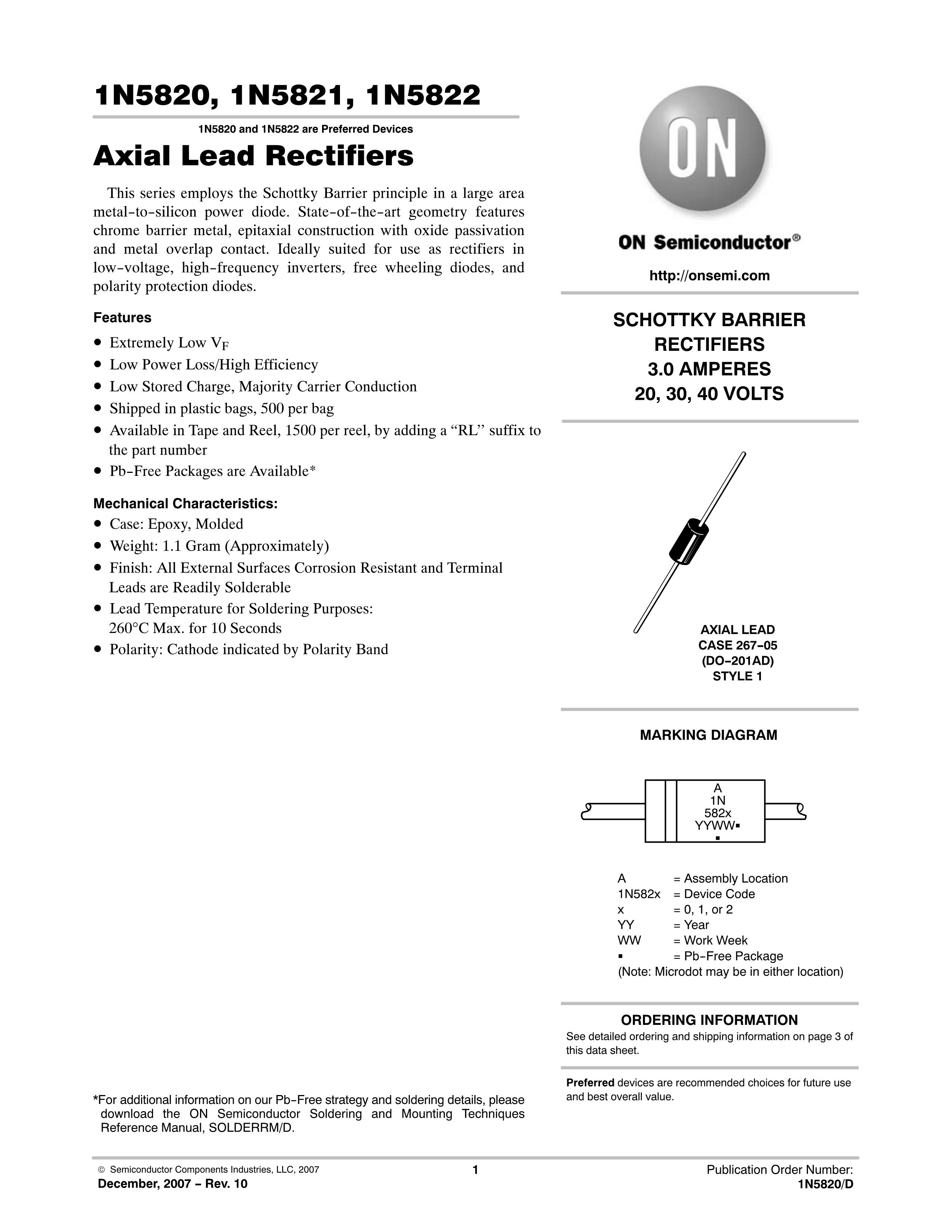 1N5820RLG数据手册DO-201AD封装onsemi(安森美)PDF规格书,中英文下载