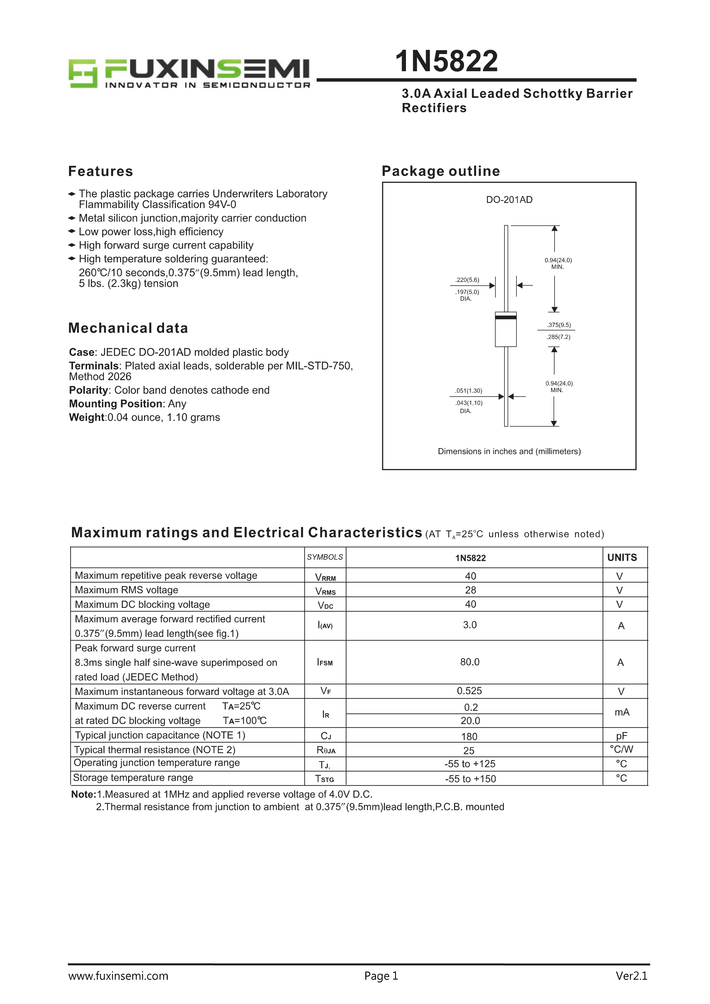 1N5822数据手册DO-201AD封装FUXINSEMI(富芯森美)PDF规格书,中英文下载