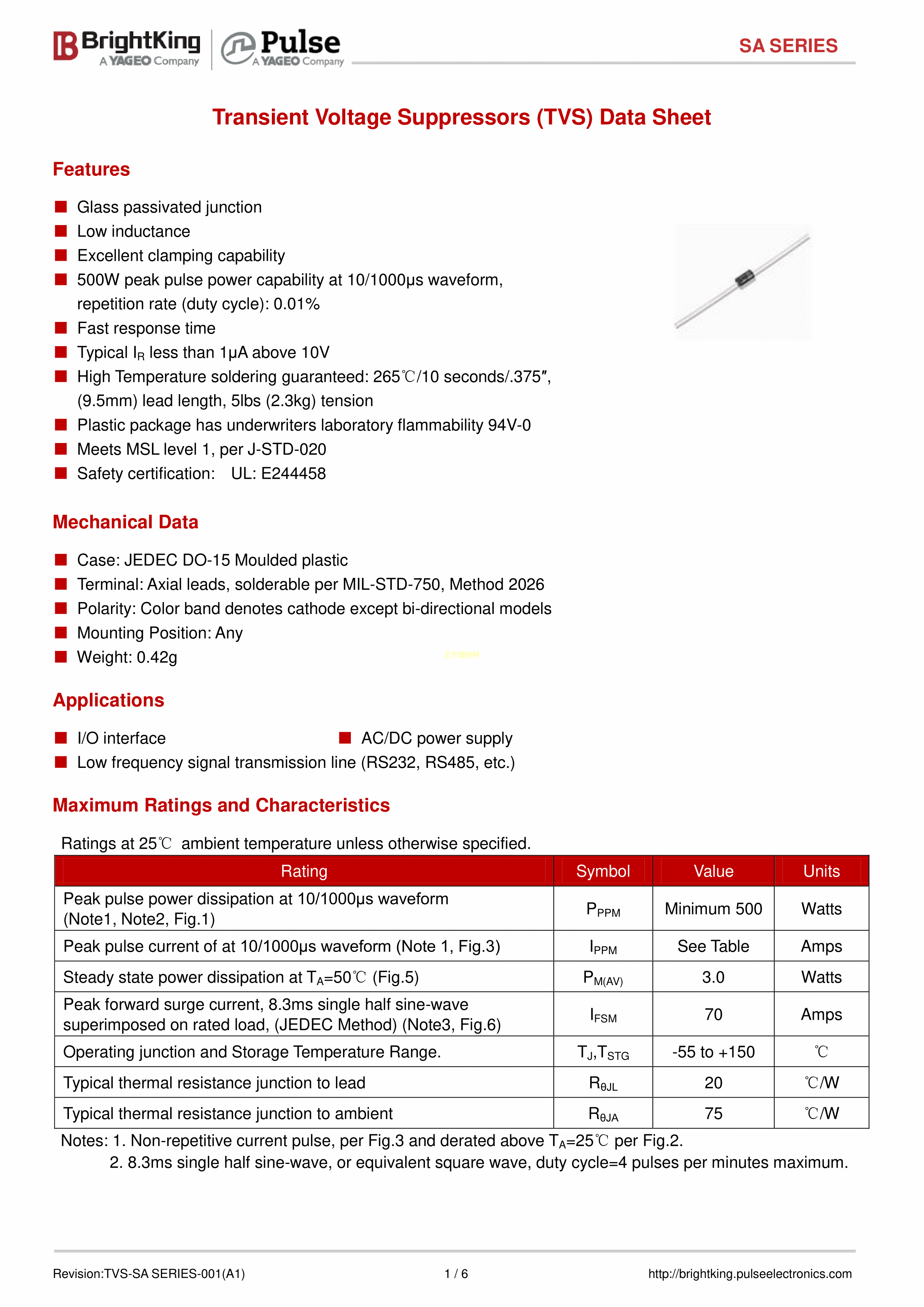 SA5.0CA数据手册DO-15封装Brightking(台湾君耀)PDF规格书,中英文下载