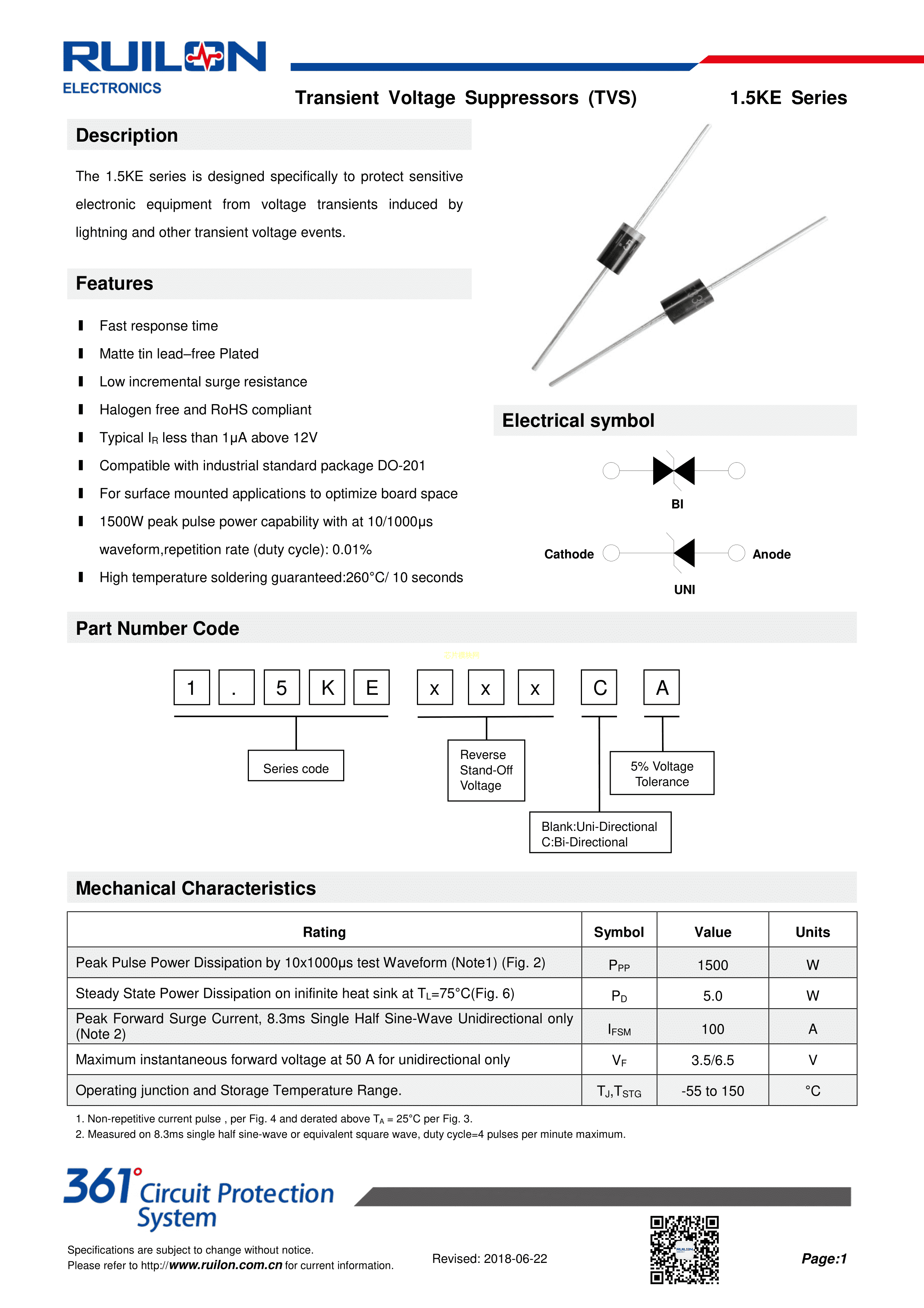 1.5KE220A数据手册DO-201封装BORN(伯恩半导体)PDF规格书,中英文下载