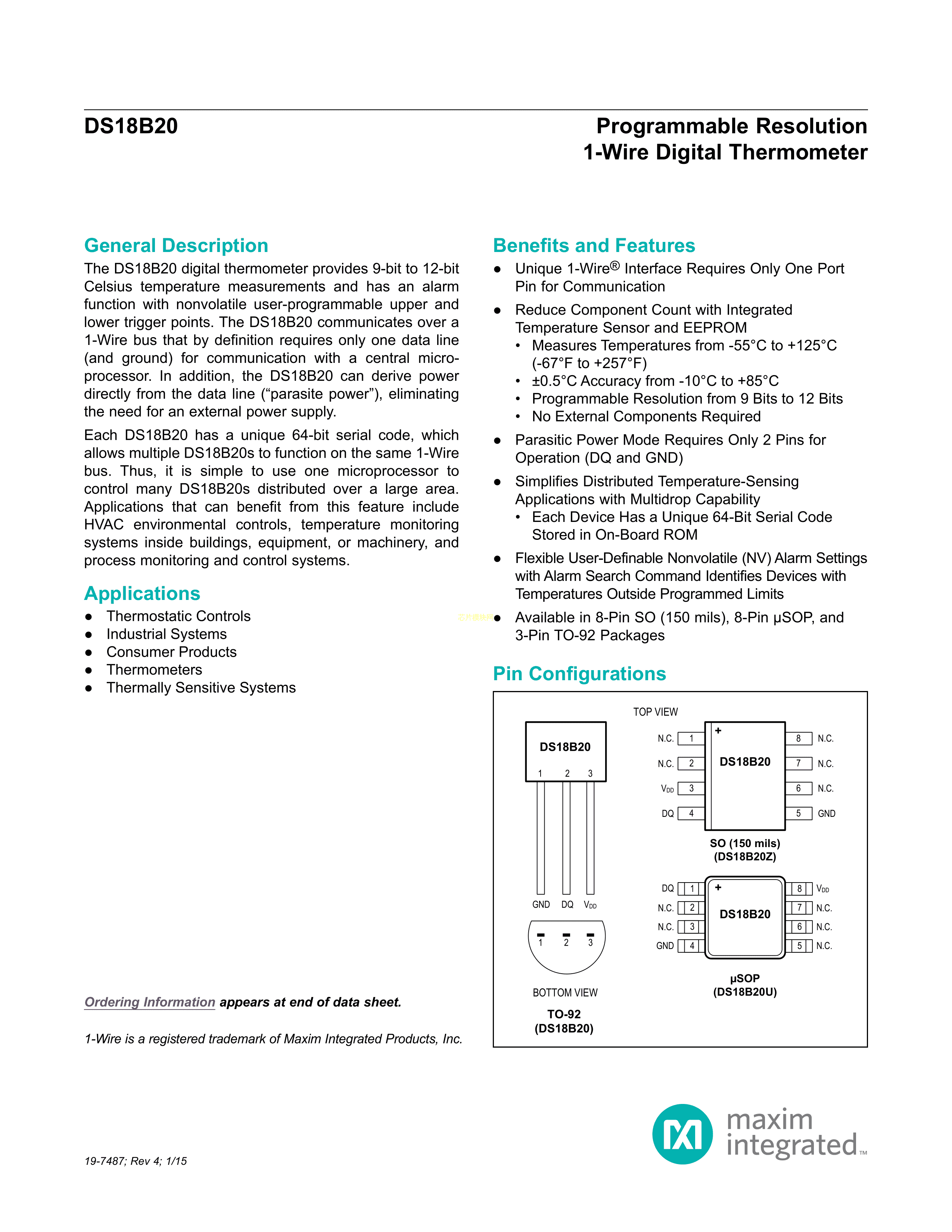 DS18B20U+TR数据手册FSOP-8封装MAXIM(美信)PDF规格书,中英文下载