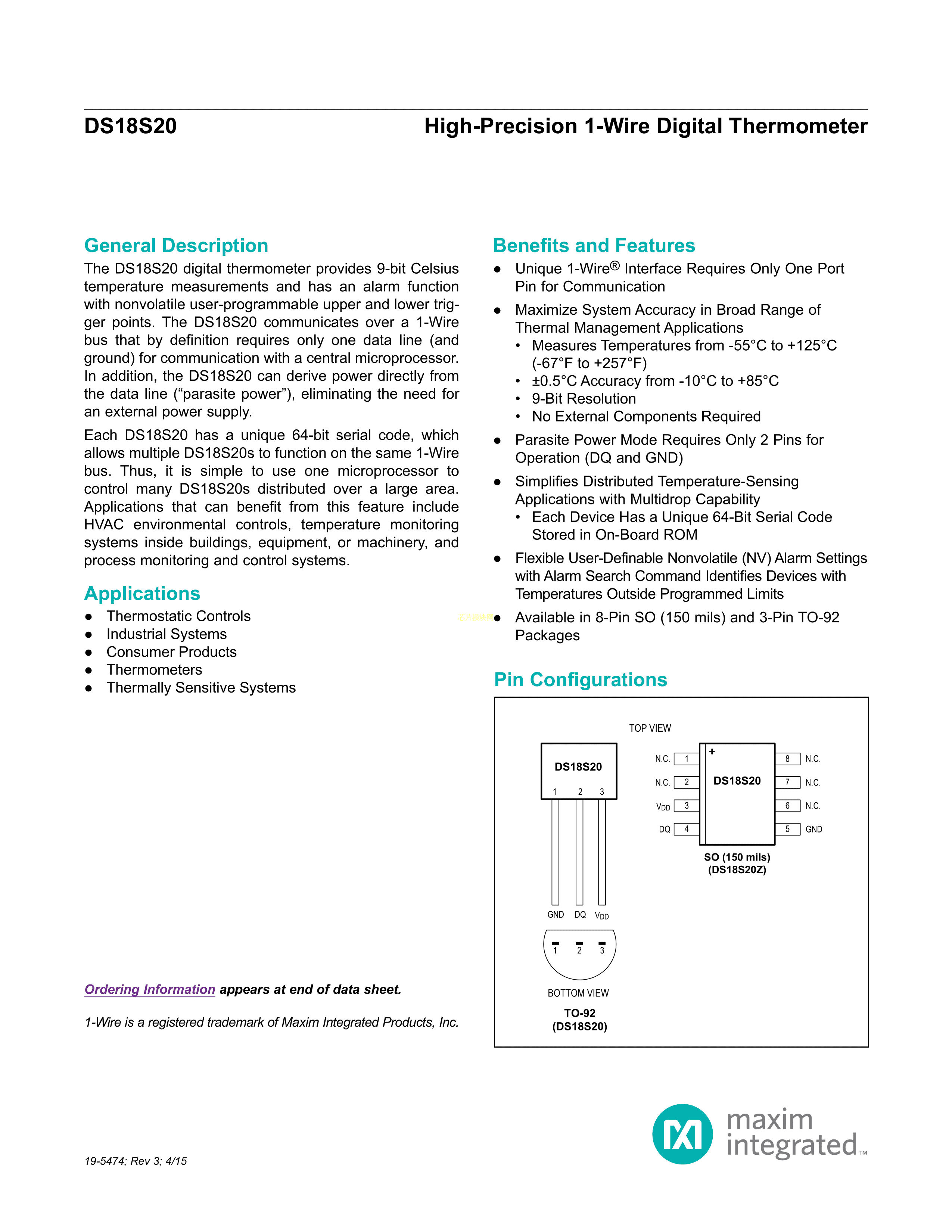 DS18S20+TR数据手册TO-92_Forming1封装MAXIM(美信)PDF规格书,中英文下载