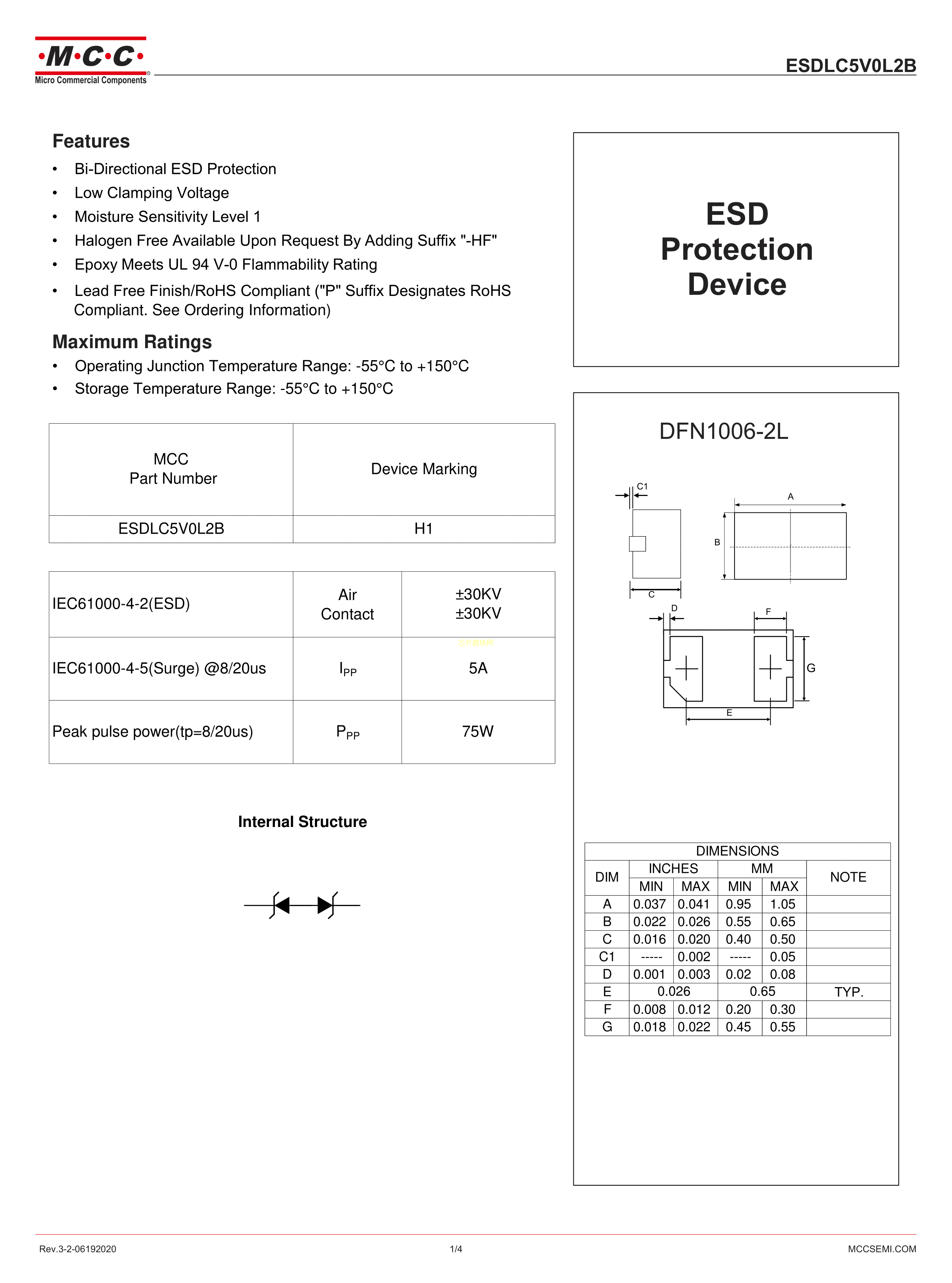 ESDLC5V0L2B-TP数据手册DFN1006封装MCC(美微科)PDF规格书,中英文下载