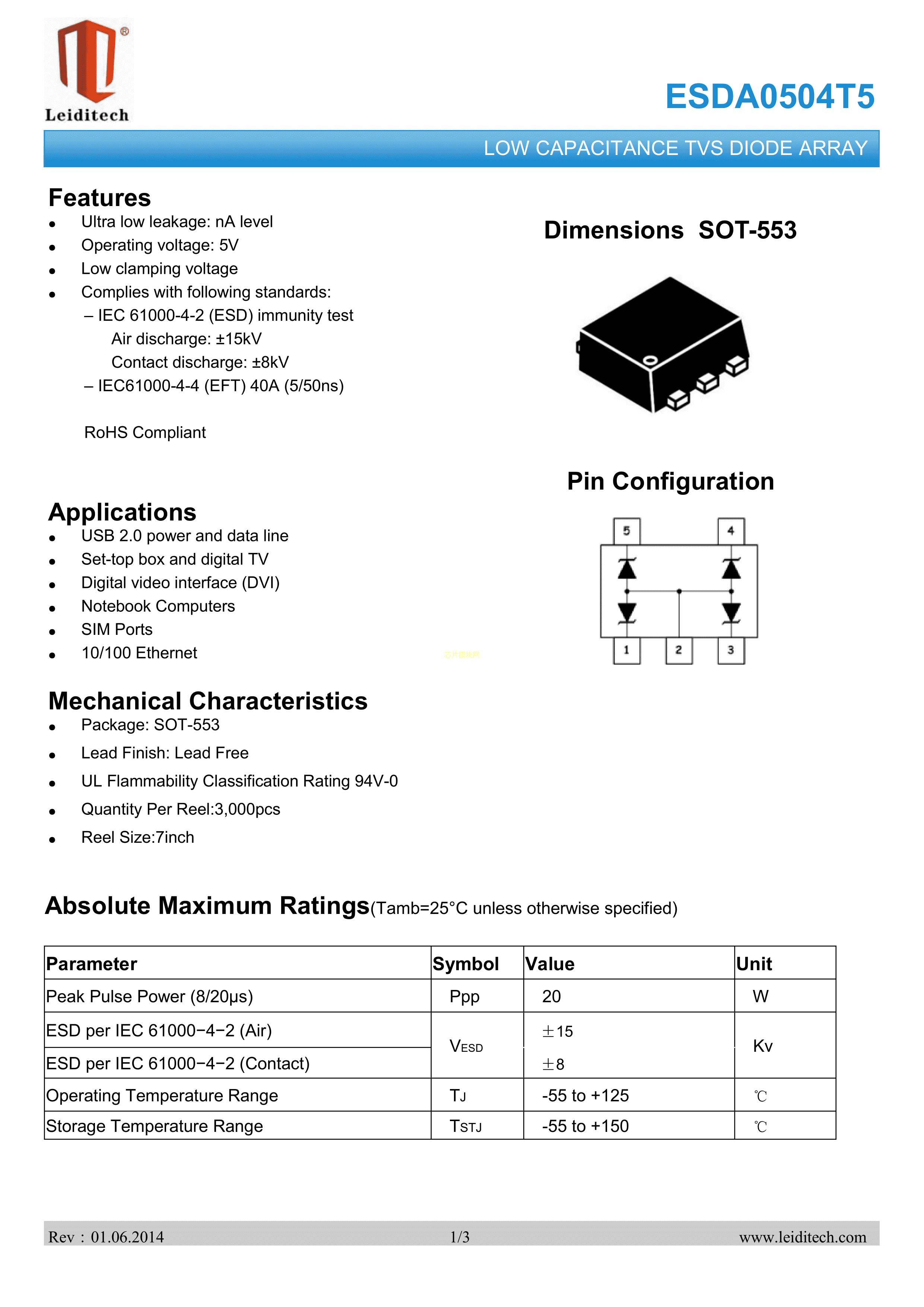 ESDA0504T5数据手册SOT-553封装Leiditech(雷卯电子)PDF规格书,中英文下载