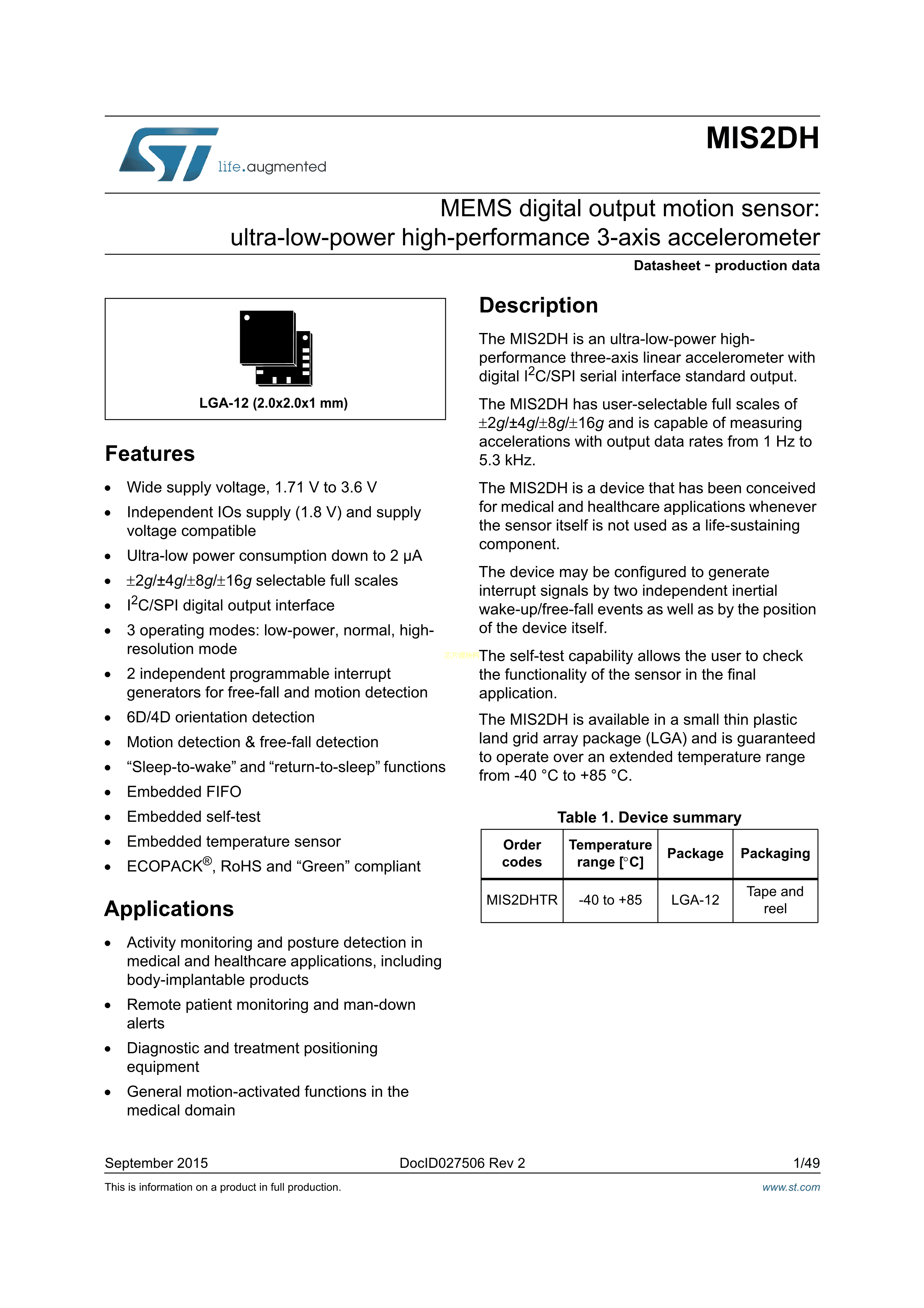 MIS2DHTR数据手册LGA-12(2x2)封装ST(意法半导体)PDF规格书,中英文下载
