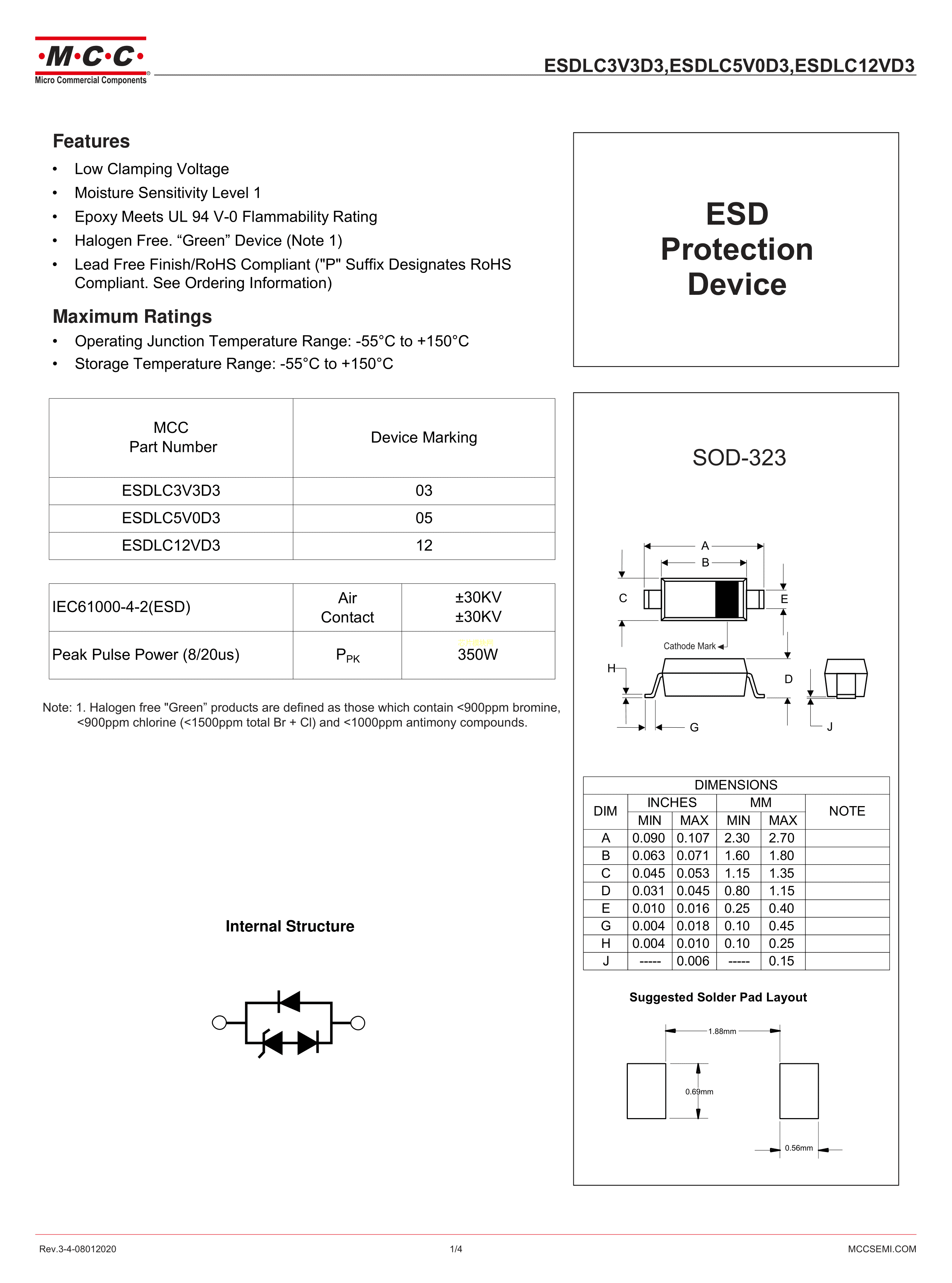 ESDLC3V3D3-TP数据手册SOD-323封装MCC(美微科)PDF规格书,中英文下载
