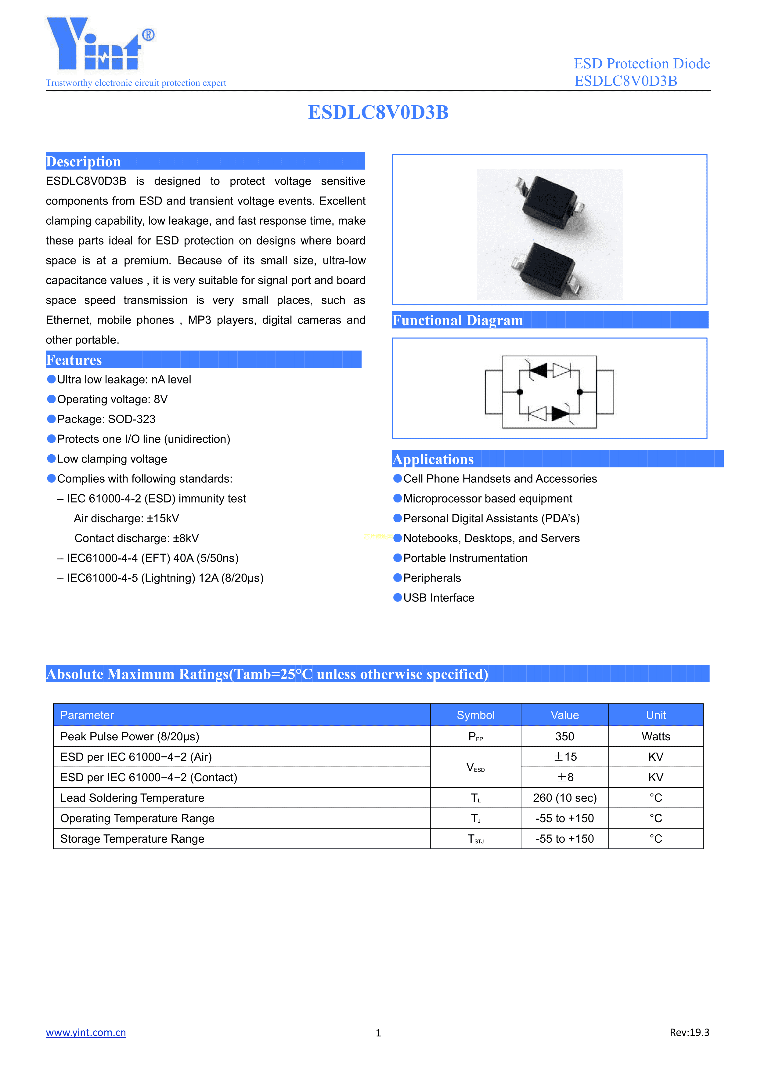 ESDLC8V0D3B数据手册SOD-323封装Yint(音特电子)PDF规格书,中英文下载