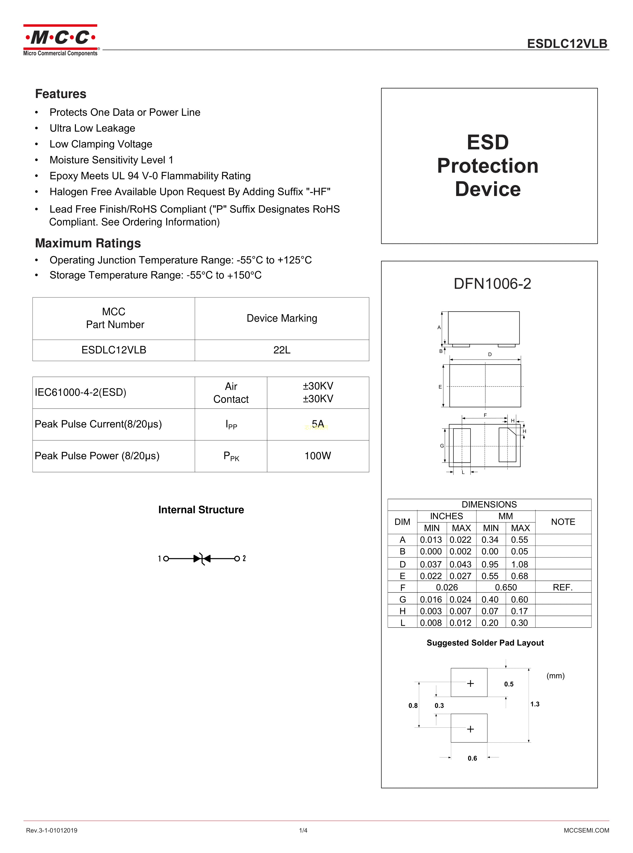 ESDLC12VLB-TP数据手册DFN1006封装MCC(美微科)PDF规格书,中英文下载