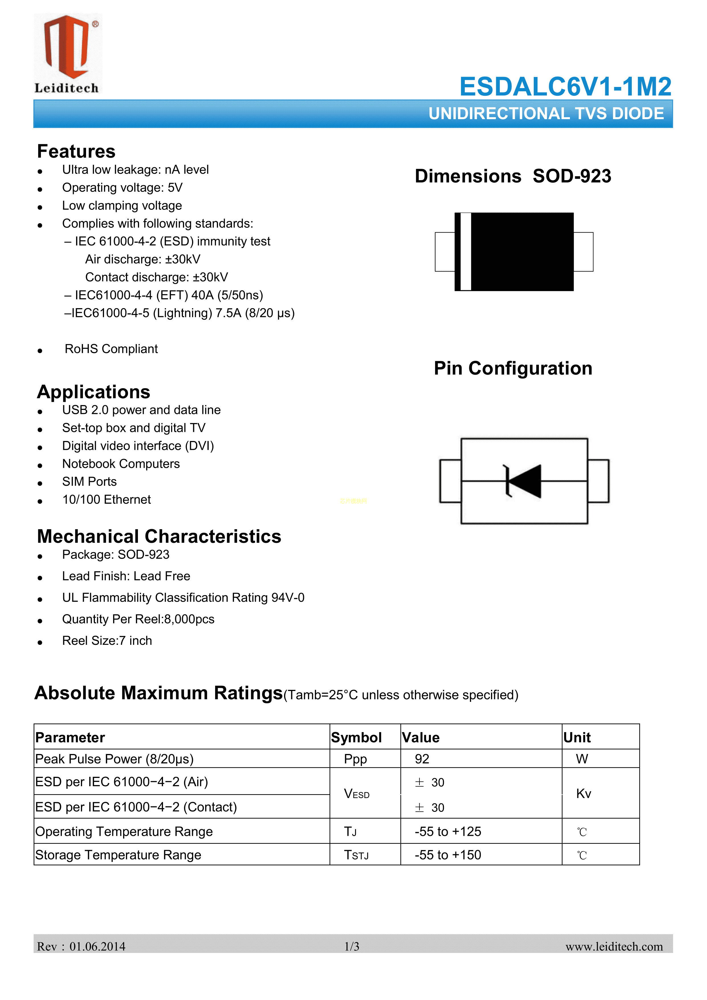 ESDALC6V1-1M2数据手册SOD-923封装Leiditech(雷卯电子)PDF规格书,中英文下载