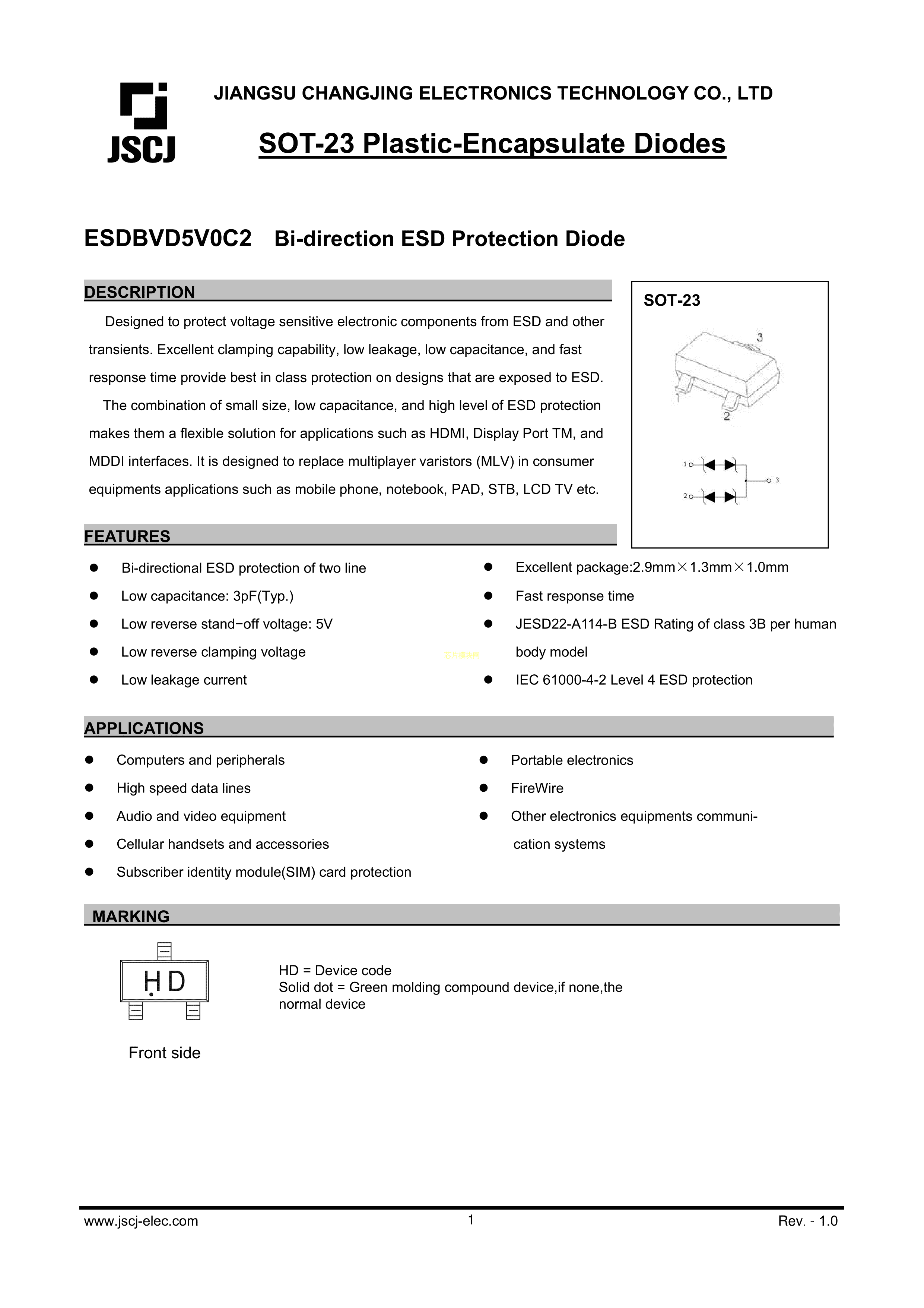 ESDBVD5V0C2数据手册SOT-23封装CJ(江苏长电-长晶)PDF规格书,中英文下载
