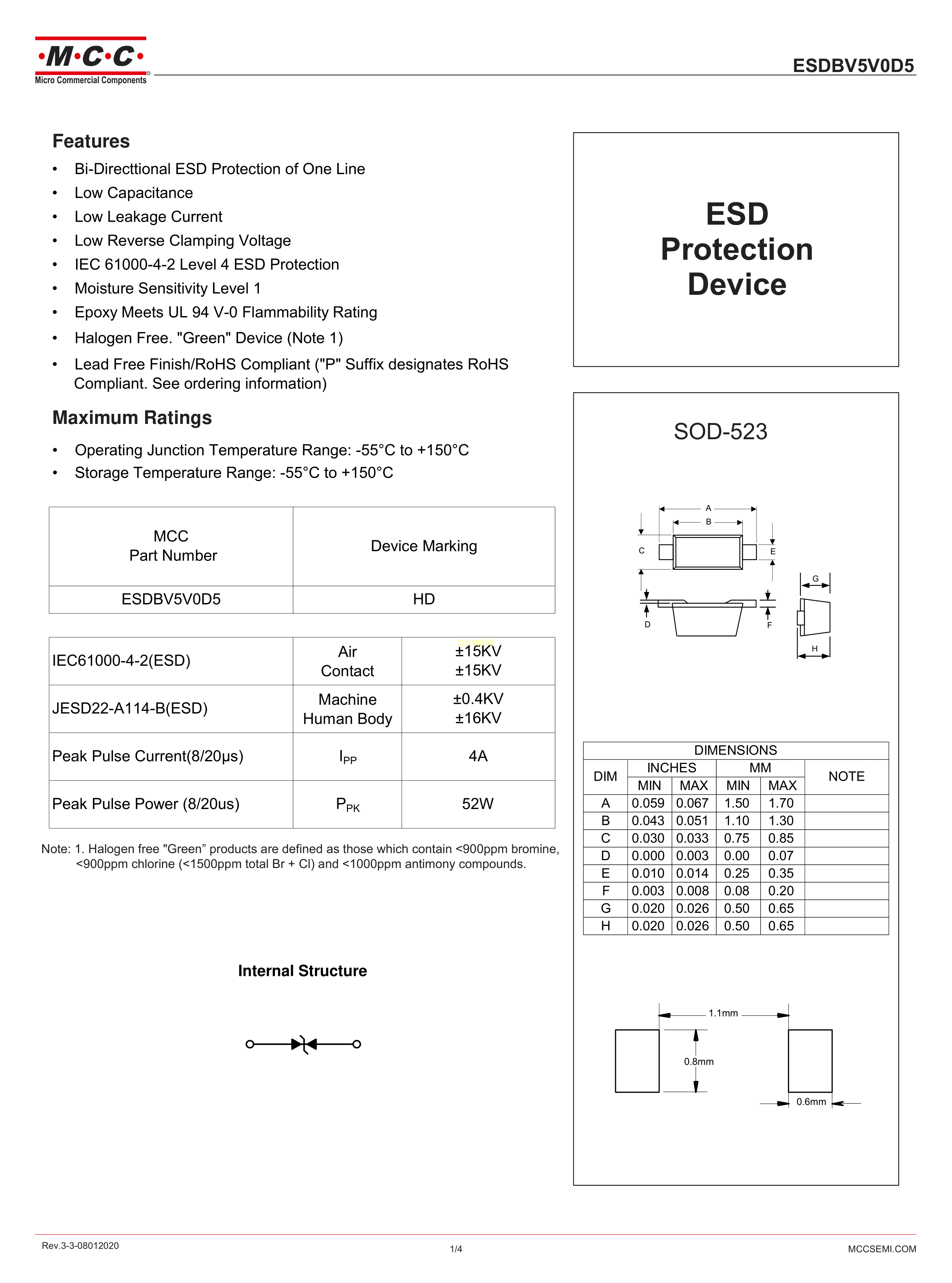 ESDBV5V0D5-TP数据手册SOD-523封装MCC(美微科)PDF规格书,中英文下载