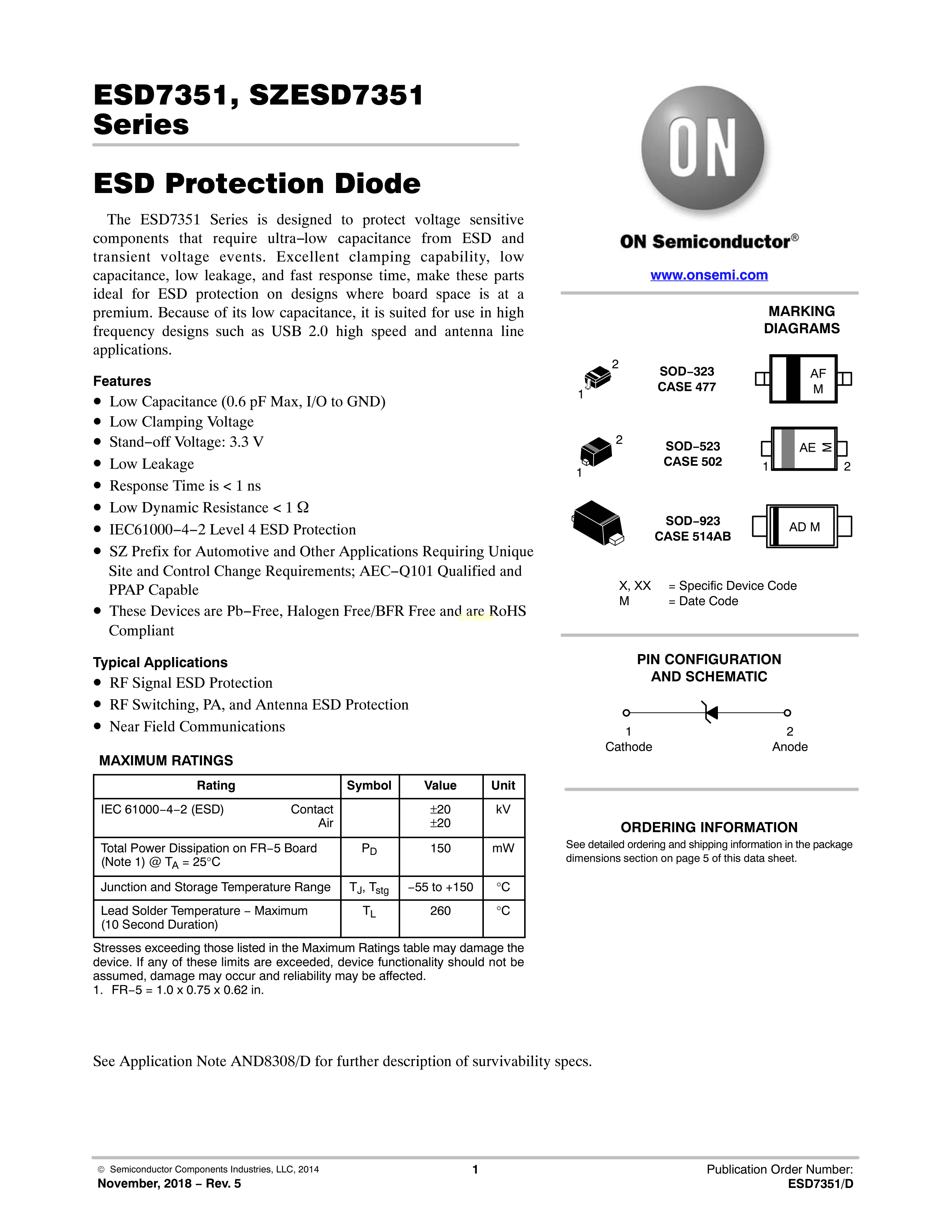 ESD7351P2T5G数据手册SOD-923封装onsemi(安森美)PDF规格书,中英文下载